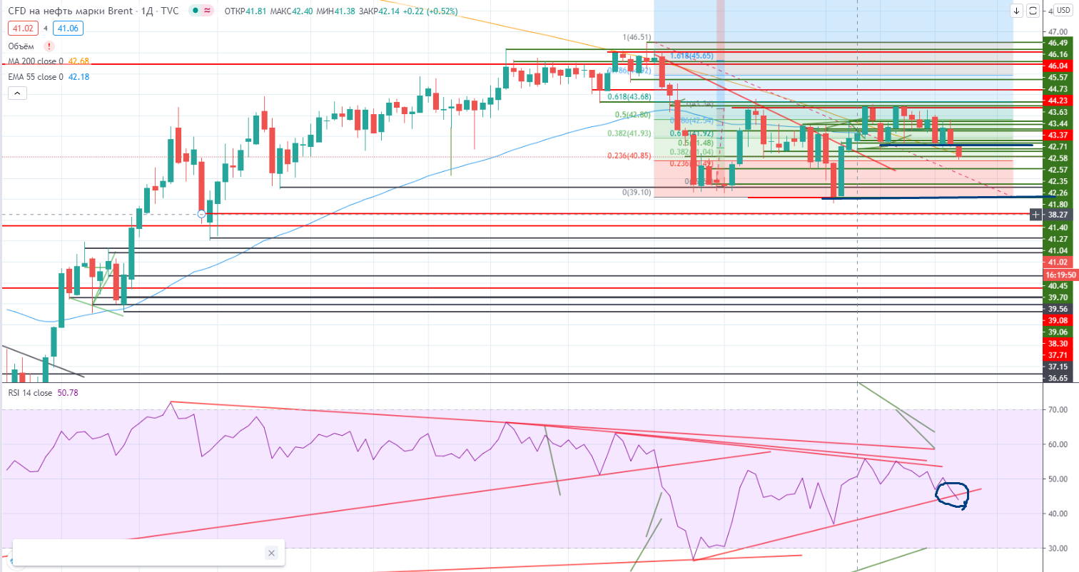 Нефть снова пролилась на информации о том что Нефтяная национальная корпорация Ливии заявила, что она повысит добычу нефти на 800 тыс. баррелей в день за две недели и на 1 млн. баррелей в день за четыре недели. Об этом я и предупреждал. Так что нефть должна все таки стоить дешевле. Она вышла ниже уровня «малого» канала $41,7 и судя по всему отправится к зоне $39,1-$39,7