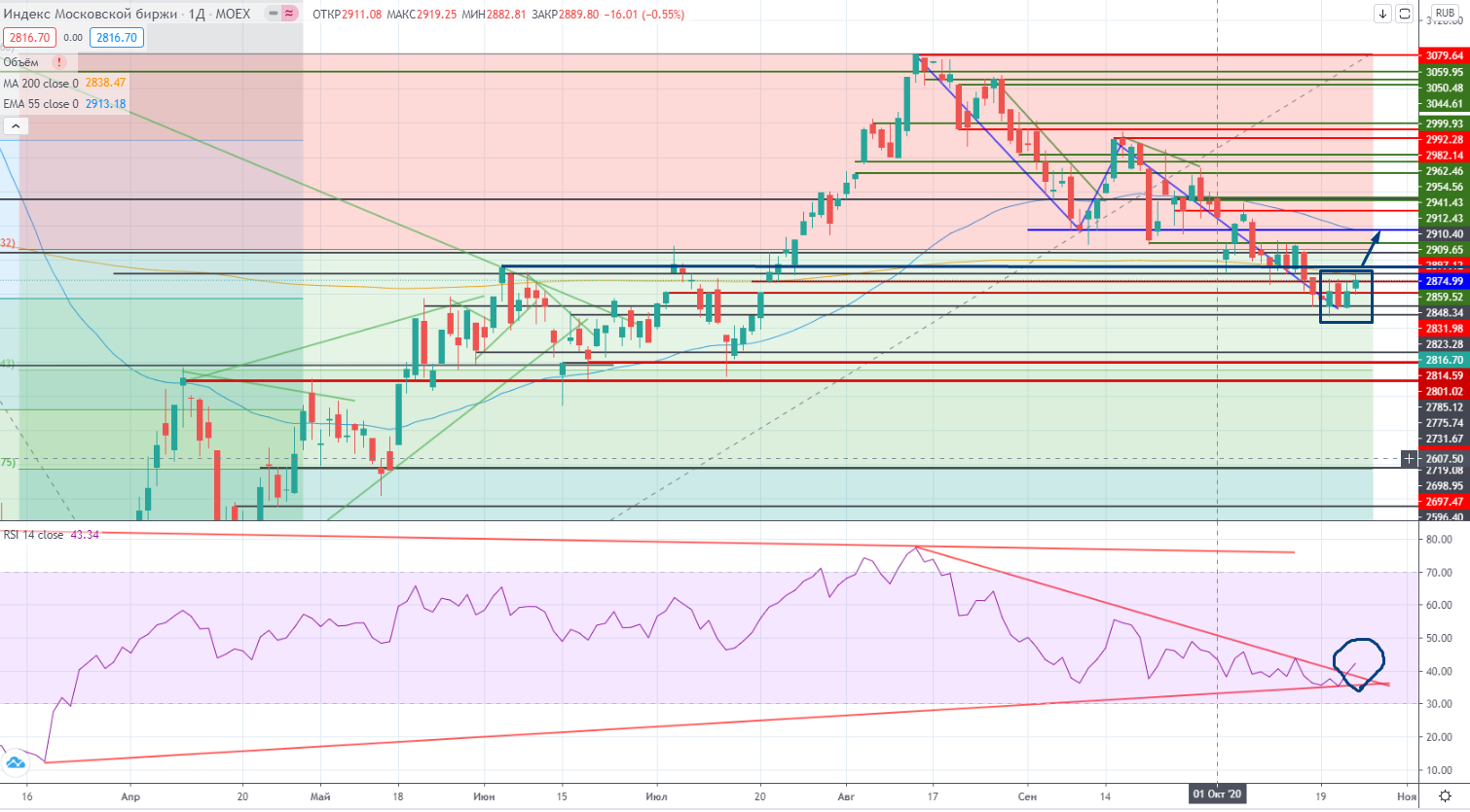 В пятницу наметился разворот вверх на индексе ММВБ. Но пока это только попытка, т.к. пока не пройден ни уровень максимума среды 2817, да и пока не пройден уровень 2832-2835 говорить о развороте еще рано. Единственное, что косвенно говорит за разворот это RSI, который пробил свой тренд, но это только косвенное подтверждение.
