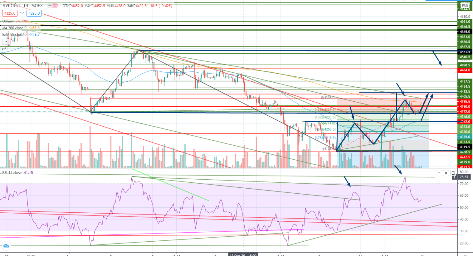 В случае же позитивного развития событий я помню, что рост не может быть вечным, поэтому закрытие лонга и может даже вход в шорт от 4400 (мишень) до 4430 (уровни), со стопом 4440+.