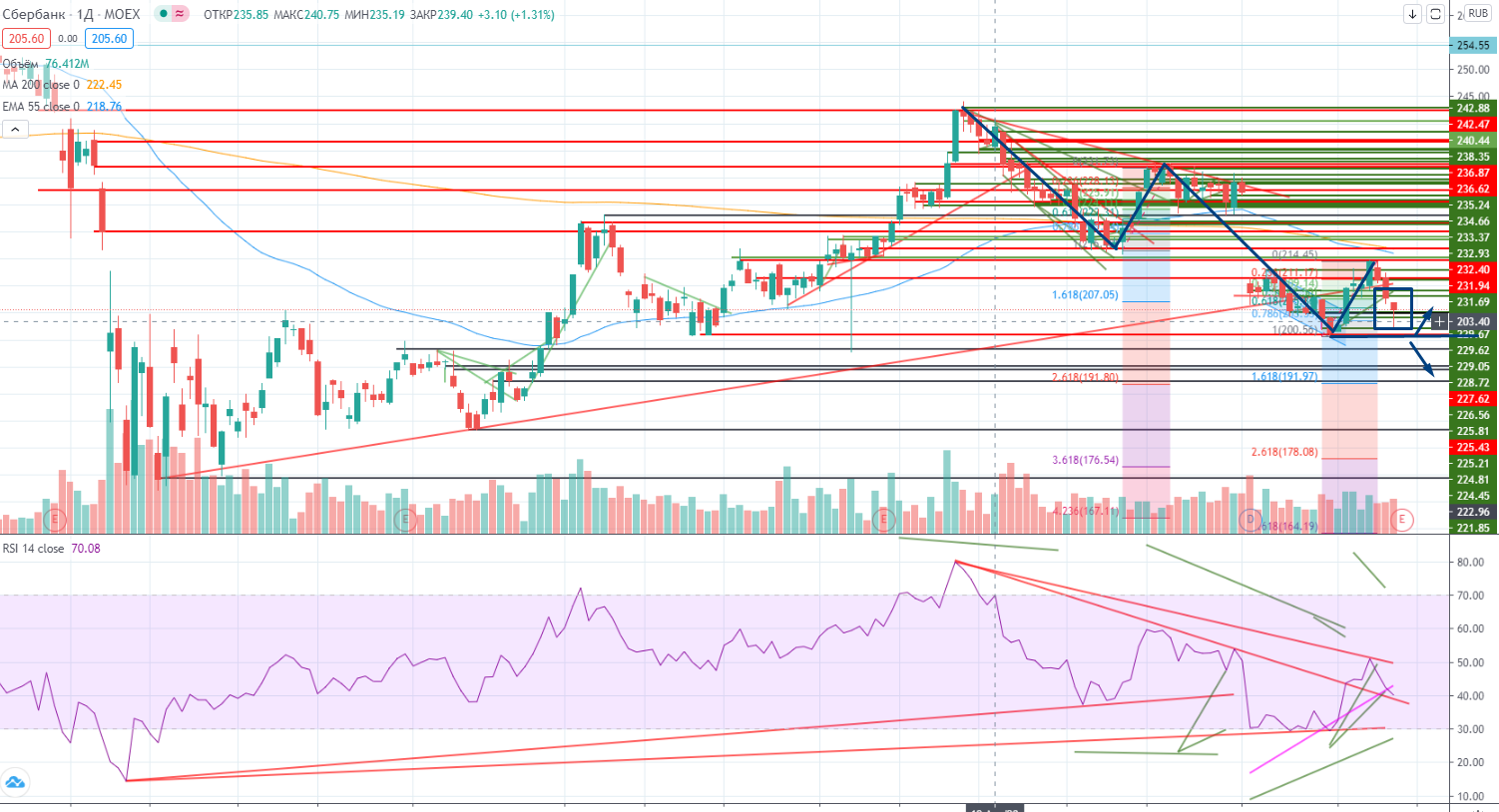 В Сбере на днях находится пока тоже в падающем импульсе, нарисовали «Молот», что может вызвать коррекцию от падения. Но еще раз повторю, хоть Сбер и выгодно отличается от своих «собратьев», но и он может также сильно пойти вниз при проходе ниже 201, Но в тоже время это уровень, так что пока он выглядит нейтрально (если этот термин применим к этой ситуации)