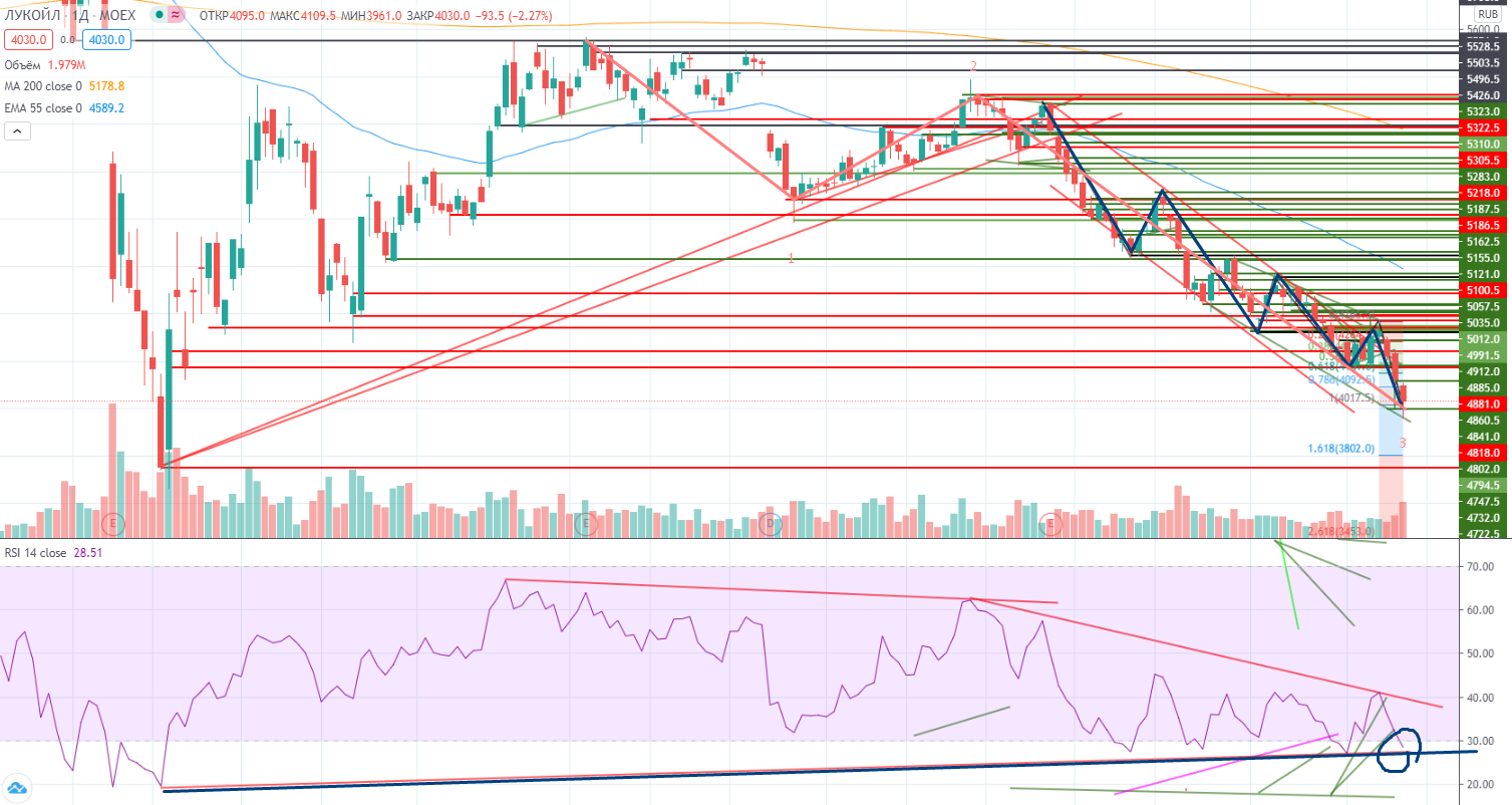 В Лукойле тоже все совсем нехорошо, но тут картина может быть чуть лучше, RSI пока над трендом. Но только на этом основании покупать нельзя, закрывать или прикрывать шорт можно, НО ПОКУПАТЬ НЕЛЬЗЯ!