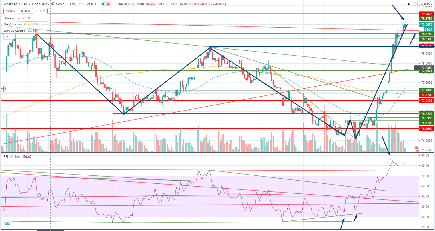 Доллар может в моменте ослабнуть (подошел к тренду), но при проходе уровня 79,1-79,2 может произойти вынос еще до как минимум 80,87, так что есть еще где рост…