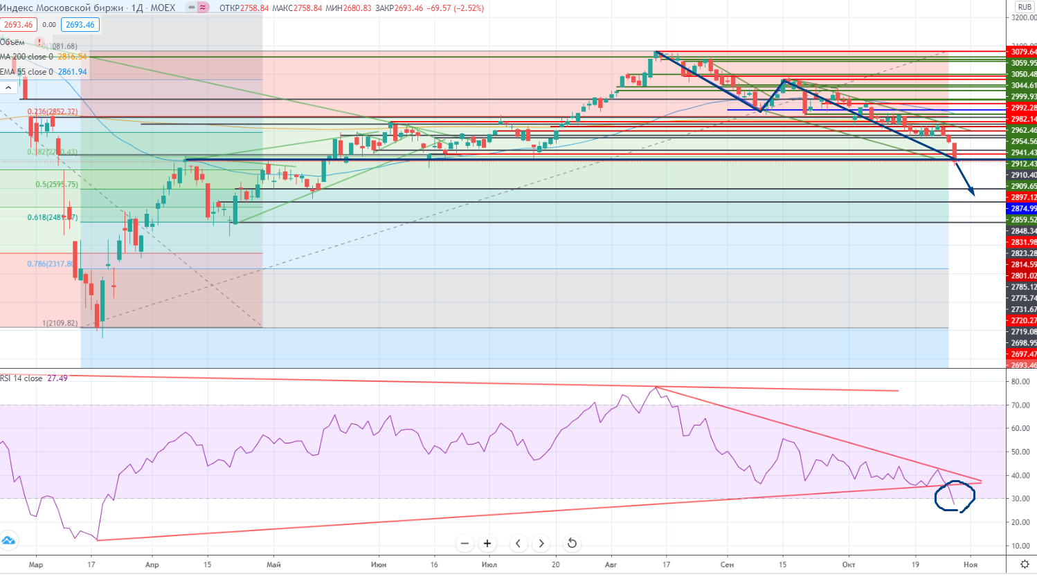 По поводу моей торговли: я закрыл почти сразу лонг (благо всего ¼) в Сбере ( https://www.finam.ru/analysis/marketnews/lukoiyl-i-gazprom-na-tkushix-urovnyax-prodavat-uzhe-strashno-20201028-10450/), и почти ничего не делал. Получил убыток -0,08%, вот что значит торговать на отскок. Идей пока нет, но мы стоим действительно на грани срыва вниз, и возможно я и воспользуюсь этим отскоком и зайду в шорт по акциям и в лонг по доллару. Буду смотреть по ситуации.