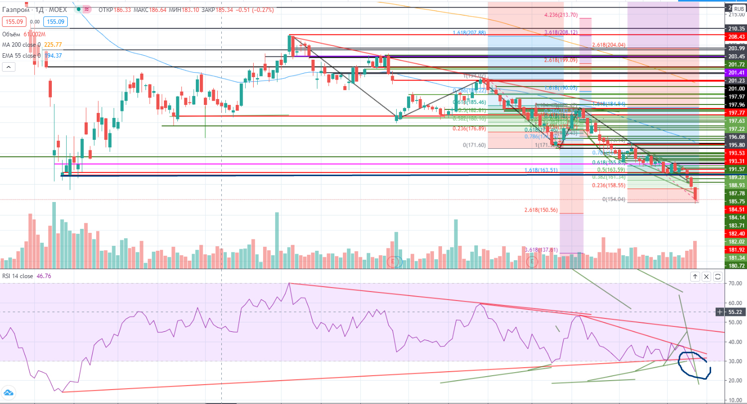 Как я и писал вчера (https://www.finam.ru/analysis/marketnews/lukoiyl-i-gazprom-na-tkushix-urovnyax-prodavat-uzhe-strashno-20201028-10450/), «О слабости «Газпрома» я твержу постоянно, и вот наконец-то он не только ниже «ковидного минимума», но и RSI пробивает свой тренд. Не хватает только ПАНИКИ, которая, возможно, будет впереди… Торговать исключительно от шорта по движению, закрываясь по стопу и выставлением более высокой заявки на продажу-вот моя рекомендация на сегодня. И эта рекомендация действует, пока цены ниже 163-163,7, а там надо смотреть...». Все рекомендации остались в силе. Да упал сильно, но это не значит, что не может упасть еще сильнее. Ведь самая слабая бумага не сможет расти без драйверов, а пока такого драйвера нет.