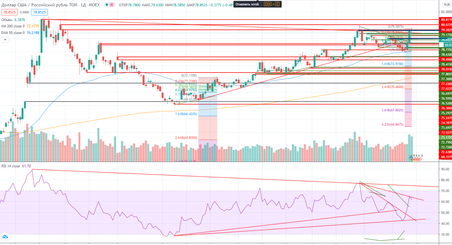 Интересная деталь, что доллар не укрепился к рублю. Не прошел локальный хай 79,1-79,2, хотя в моменте пытался. Но вероятность повторного возврата к хаю есть, хотя возможно момент для быков уже упущен. Но все равно я буду пытаться покупать доллары частями от 78 до 78,4 с общим стопом 77,9-. Хотя очень опасно.