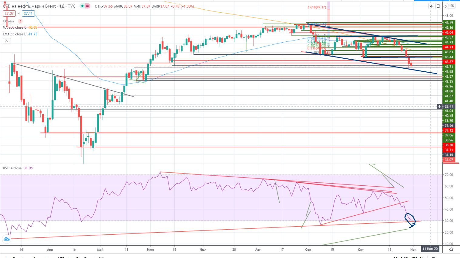 Вчера был день нефти. Без сомнений. Она не только вышла из горизонтального канала, в котором пребывала с сентября месяца, но и почти достигла первой мишени для наклонного канала (https://www.finam.ru/analysis/marketnews/indeks-mosbirzhi-na-poroge-polnocennogo-padayushego-trenda-20201029-09550/) $36,5±. Но RSI при этом почти пришел к своему дивергентному тренду, поэтому от первого шока я думаю уже избавились. Теперь большой вопрос, куда? По хорошему должна и дальше идти вниз, но еще раз напомню, что нефть-это больше цифровой контракт, поэтому все может быть. В том числе нельзя исключать даже возврата выше уровня пробоя. Я конечно в это не особо верю, но исключать такого нельзя полностью. Тем более перед выборами в США!!!