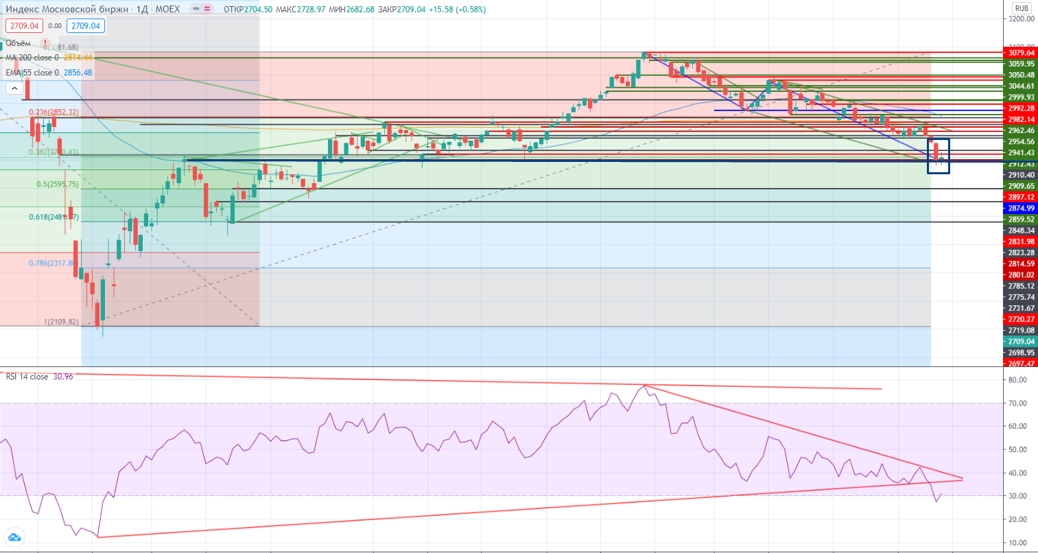 Индекс ММВБ нарисовал нечто похожее на додж на уровне, и если бы была другая ситуация возможно можно было бы принять это за попытку разворота вверх. Я начинаю уже задумываться об этом. Все плохо, даже хуже не куда, а наш рынок вдруг встал. Возможно это просто кроются медведи, они не плохо подняли за два предыдущих дня. Может ли это вызвать покупку? Я очень сомневаюсь. Ведь все складывается против покупки. Пандемия, нефть, куча новых открытых счетов физлицами… Причем еще не до конца проверенных на крепость.