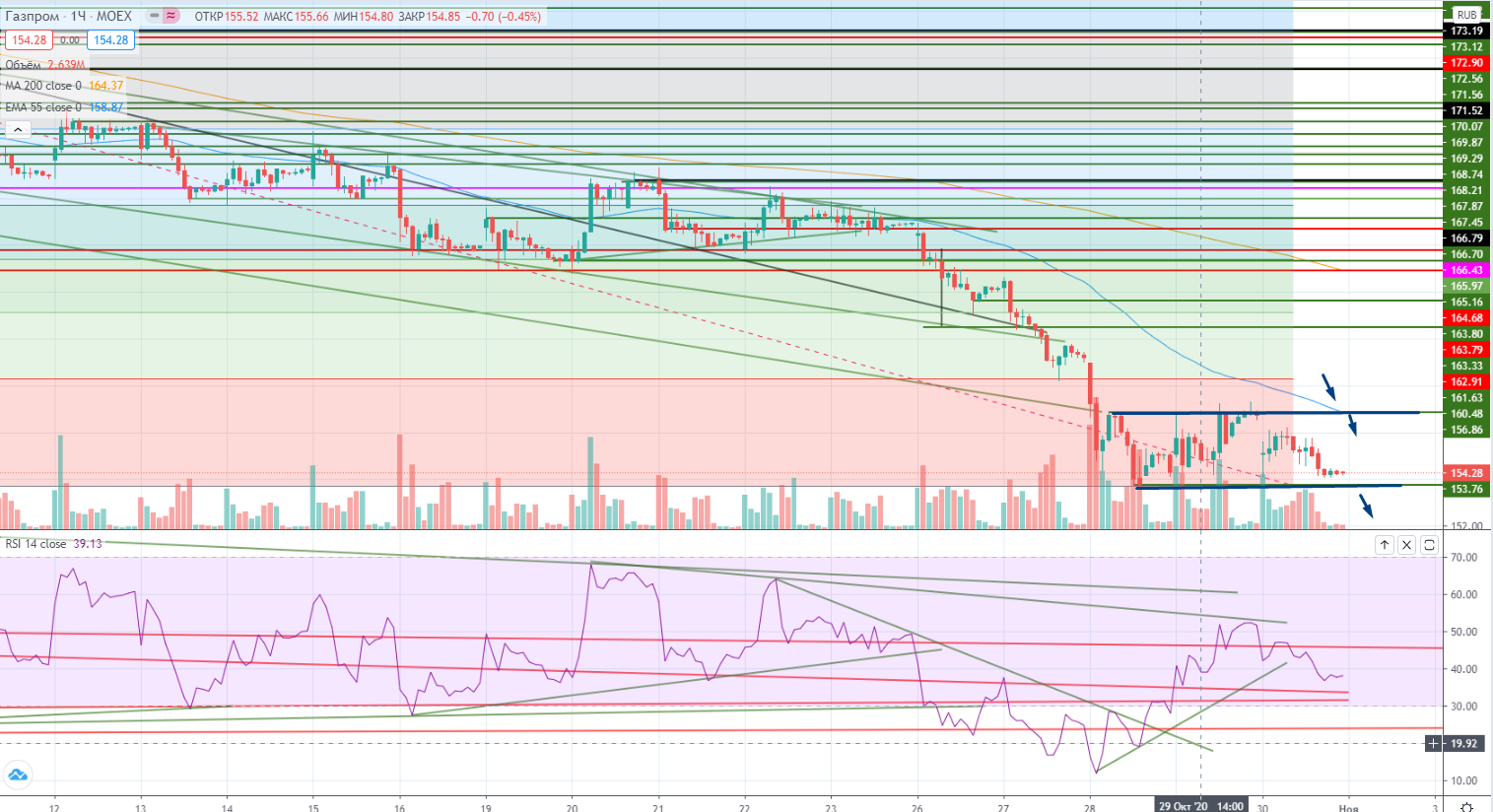 На часах опять же торговля в канале 4000-4070. Причем я это предвидел заранее (https://www.finam.ru/analysis/marketnews/rynok-szhalsya-kak-pruzhina-20201030-09350/) «Я очень хочу, чтобы наш рынок отрос. Цены поднимутся к уровням сопротивлений, RSI тоже подойдут ближе к зоне перекупленности (кстати вчера складывалась примерно такая ситуация, в Лукойле цена на месте по большому счету, а RSI уже почти на 50, по идее это показывает слабость бумаги, RSI «готовится» к проливу, но четких уровней для стопов так и нет. Примерно, аналогичная ситуация и в Газпроме ...), и можно будет относительно смело шортить.»-это цитата из этого поста.