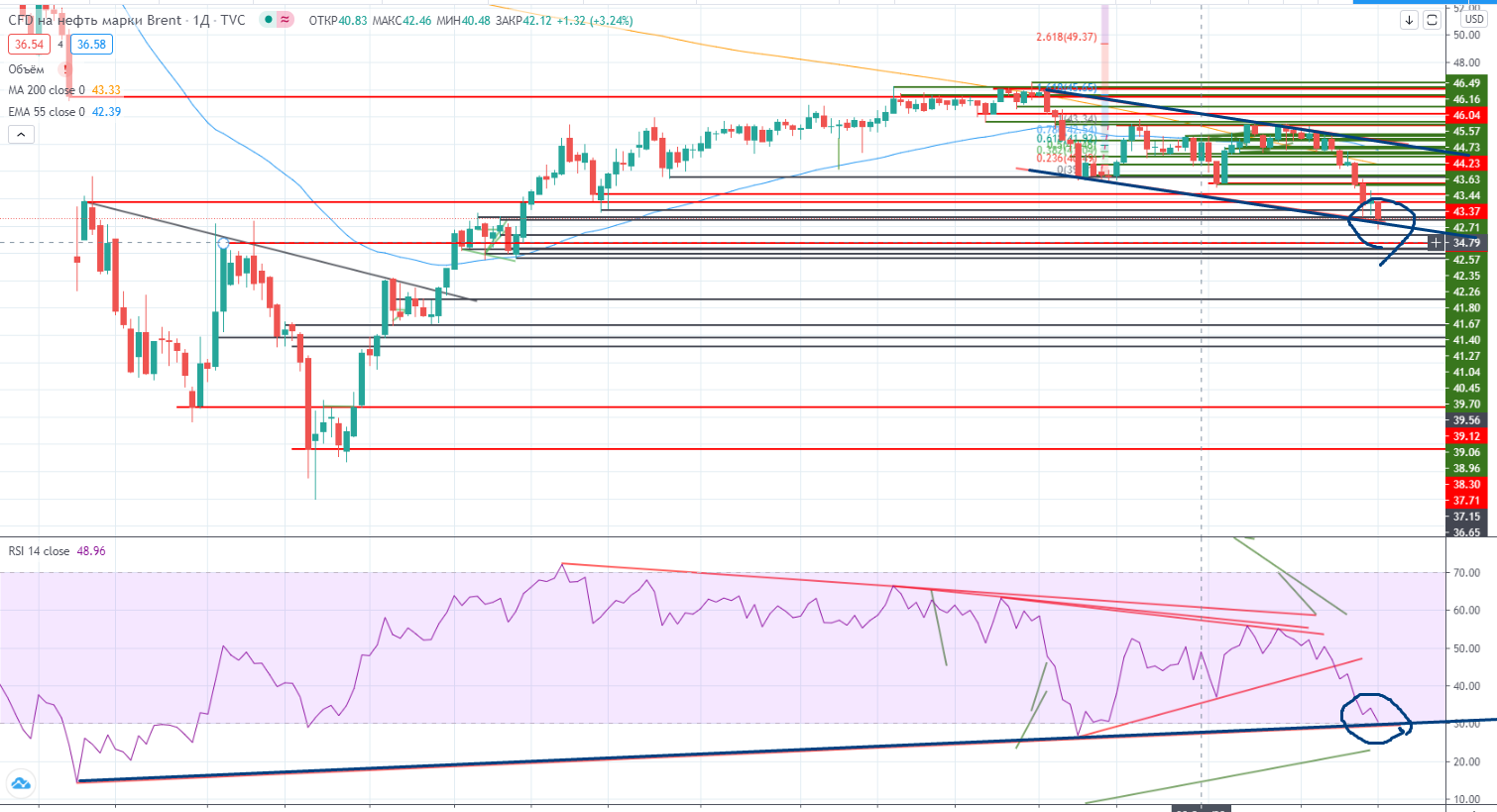 В нефти на неделе прошел выход из многомесячного канала $39,12-$43,42, достиг уровня для нового, уже наклонного канала (https://www.finam.ru/analysis/marketnews/indeks-mosbirzhi-na-poroge-polnocennogo-padayushego-trenda-20201029-09550/) $36,5± , а если считать полноценную мишень, то она находится еще ниже, на $34,8±.