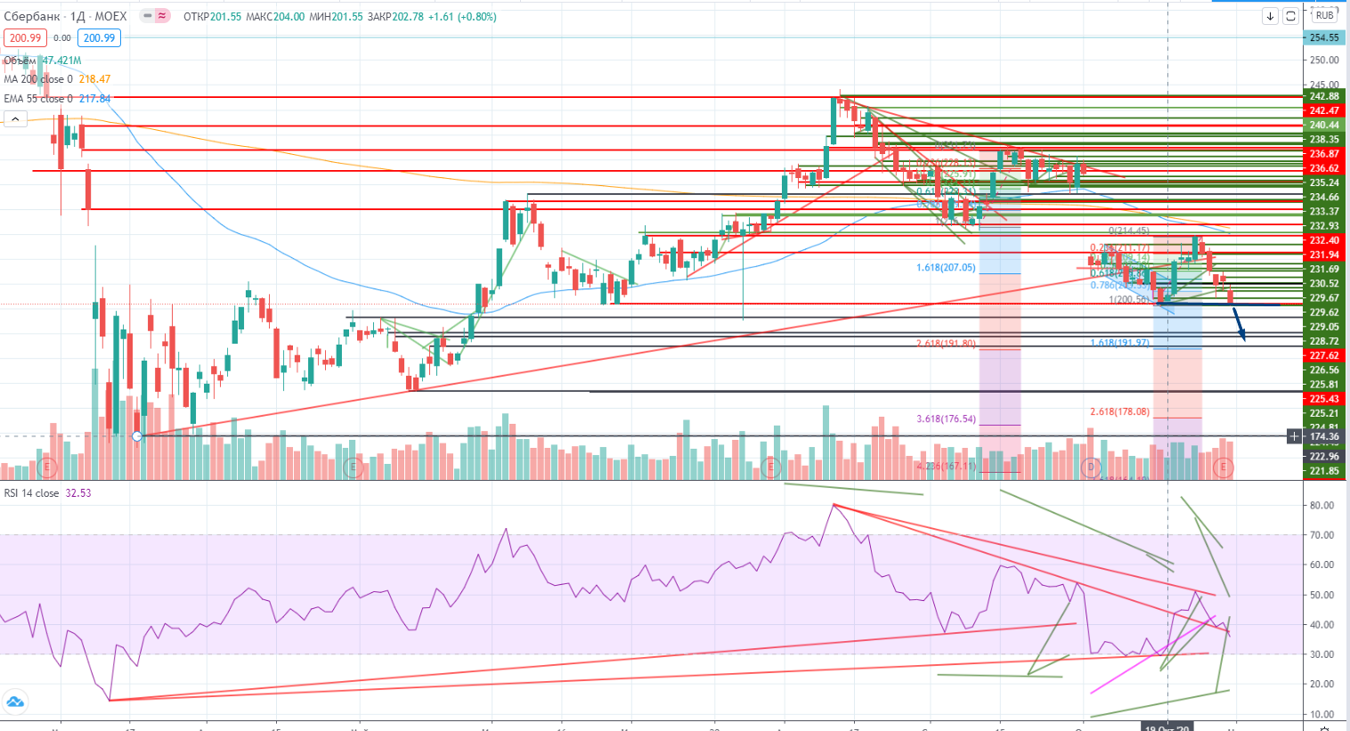 Вообще крепость Сбера мне непонятна, чем он так лучше многих бумаг был. Ну да, маркетплэйс. Ха-ха! Для шорта на часах подойдет уровень 203,4- со стопом 203,6+ или при проходе лоу 200,7- со стопом 201,1+. От покупки я не рекомендую также торговать, он был слабее многих ранее упавших бумаг и закрылся почти на лоу.