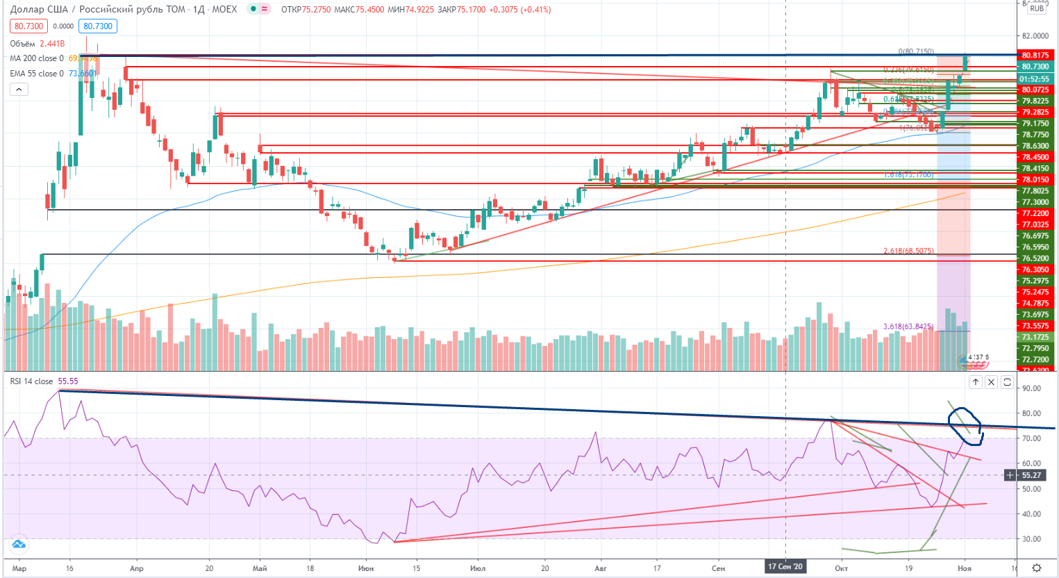 Вчера на нашем рынке наблюдался отрост, на мой взгляд на медвежьих стопах. Перед выборами в штатах и нашими выходными именно медведи стали жертвами обстоятельств. Это не очень похоже на покупку, хотя объемы стали увеличиваться. Просто и нефть отчасти помогла, да и эффект перешочивания имел место. И быки вроде начали расправлять плечи после прошлой очень нервной недели. Но есть сомнения по поводу долгосрочного роста, не смотря на разворотную фигуру по индексу ММВБ. Правда RSI пришел под тренд, но он так последнее время себя ведет, что ему не стоит особенно доверять.