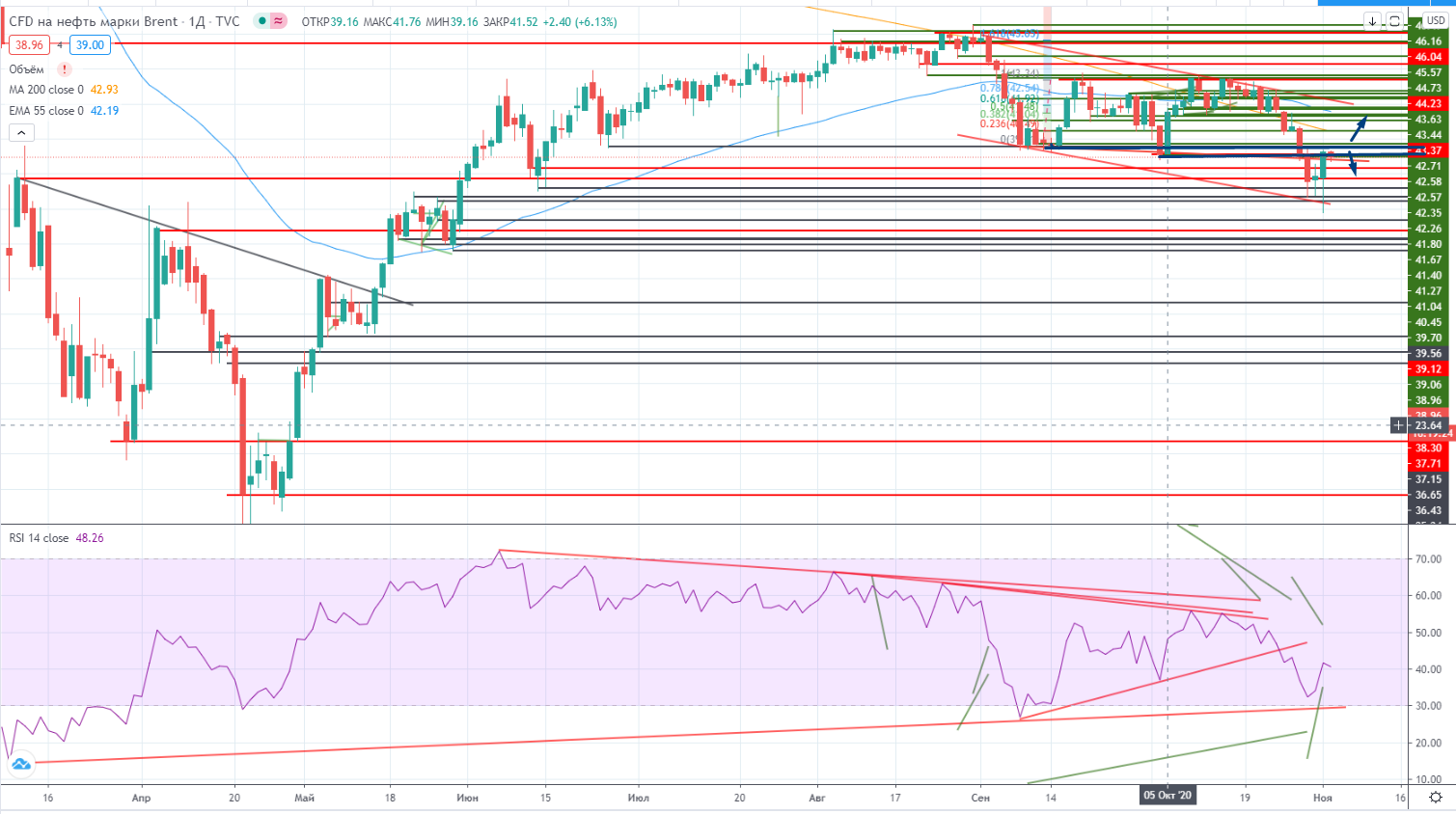 Нефть сформировала разворотную формацию, но она находится под очень сильным уровнем сопротивления $38,9-$39,7, и если его пробьют вверх, то я отказываюсь что либо понимать в ней. Рынок накануне выборов становится все более нервным и не логичным.