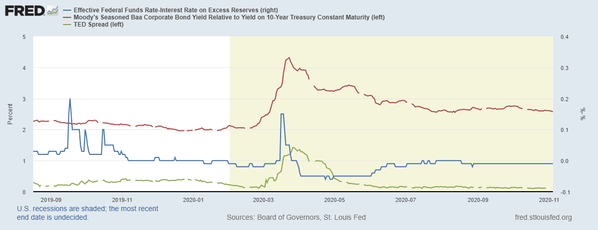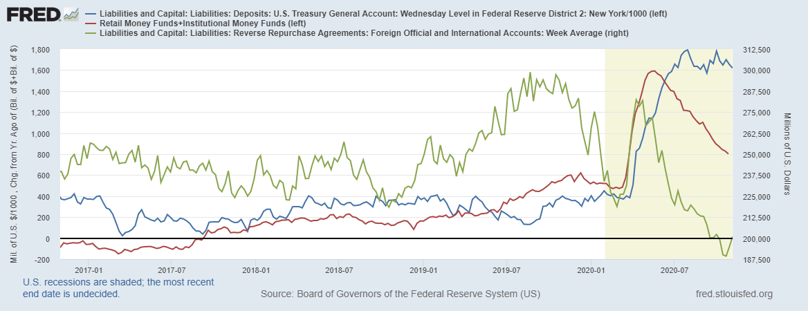 Зеленая линия – это ТЕД-спред, отображающий спрос на ликвидность на международном рынке в Лондоне (Libor). Мы уже видели, что дневные РЕПО для нерезидентов на минимальных уровнях с 2015 года, т.е. дефицита ликвидности за пределами США нет. Но со следующей недели долларовые ставки в Лондоне могут начать расти, посмотрим.