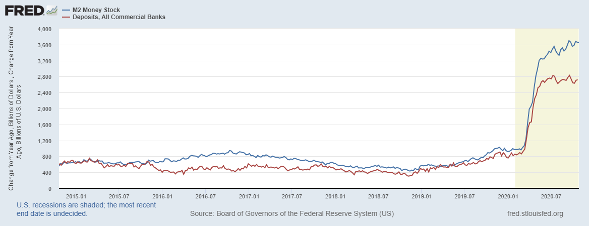 Ситуация крайне отвратительная, все деньги, поступающие на счета коммерческих банков, остаются в состоянии сбережений (депозиты) и в экономике невостребованные, что говорит о слабости экономических агентов, кредитование не растет – экономика остается в болоте. И здесь напрашивается вопрос, а зачем еще вливать деньги, если они итак невостребованные в экономике – текущая пауза в ДКП может перерасти в сокращение QE, т.е. в кредитное сжатие, но не ранее следующего года, да и пандемия с выборами может все перевернуть с ног на голову.