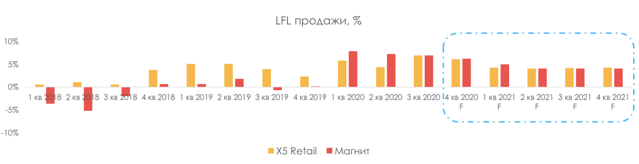 Магазины у дома (основной формат X5 и Магнита) стали еще более востребованы, так как они находятся в пешей доступности и в них есть все необходимое. В этот период X5 и Магнит смогли увеличить долю на рынке продовольственной розницы, что мы видим по динамике LFL продаж (выручка зрелых магазинов росла).