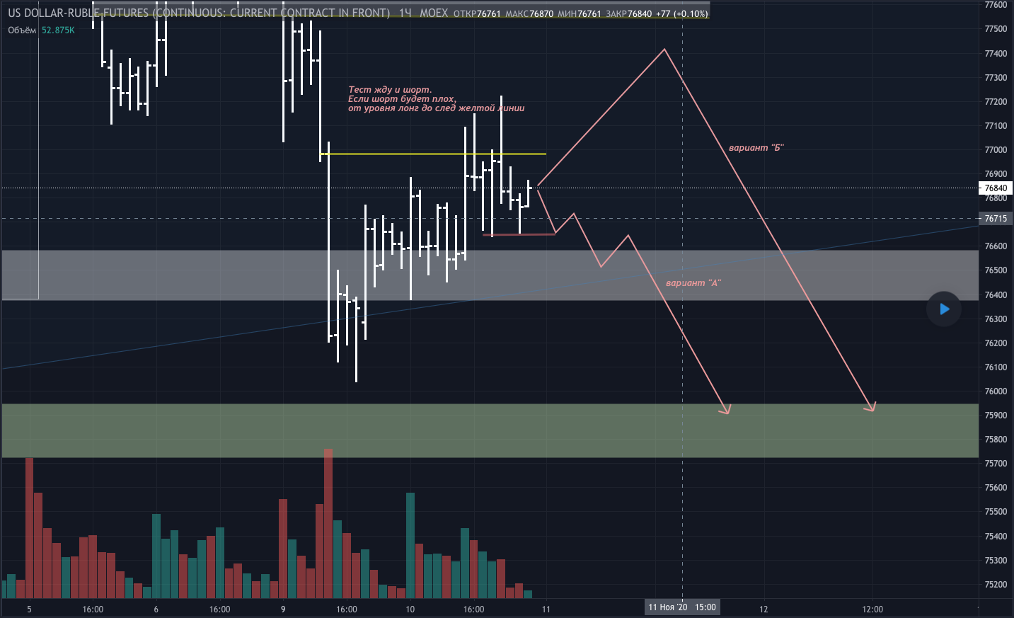 Вариант Б, если вдруг захотят обновить вчерашний максимум. Отменой идеи будет лишь пробой над второй желтой линией (технически). На самом деле, я бы уже не лез, если будет фиксация над максимумом вчерашнего дня.