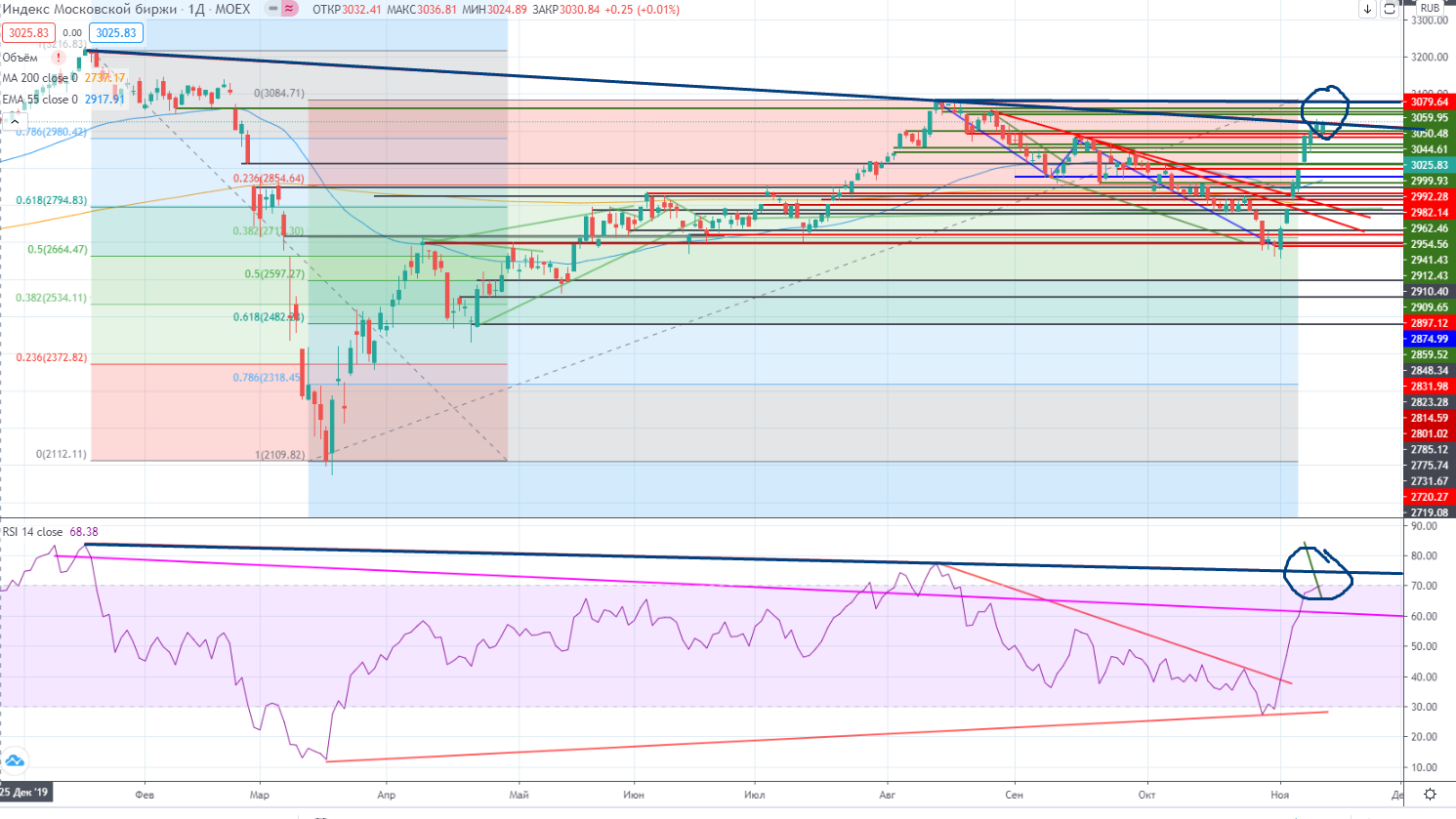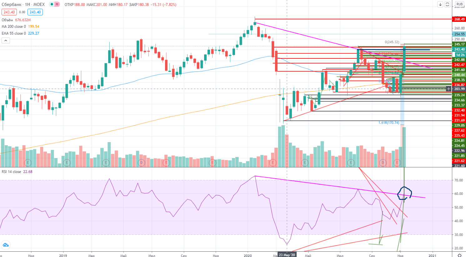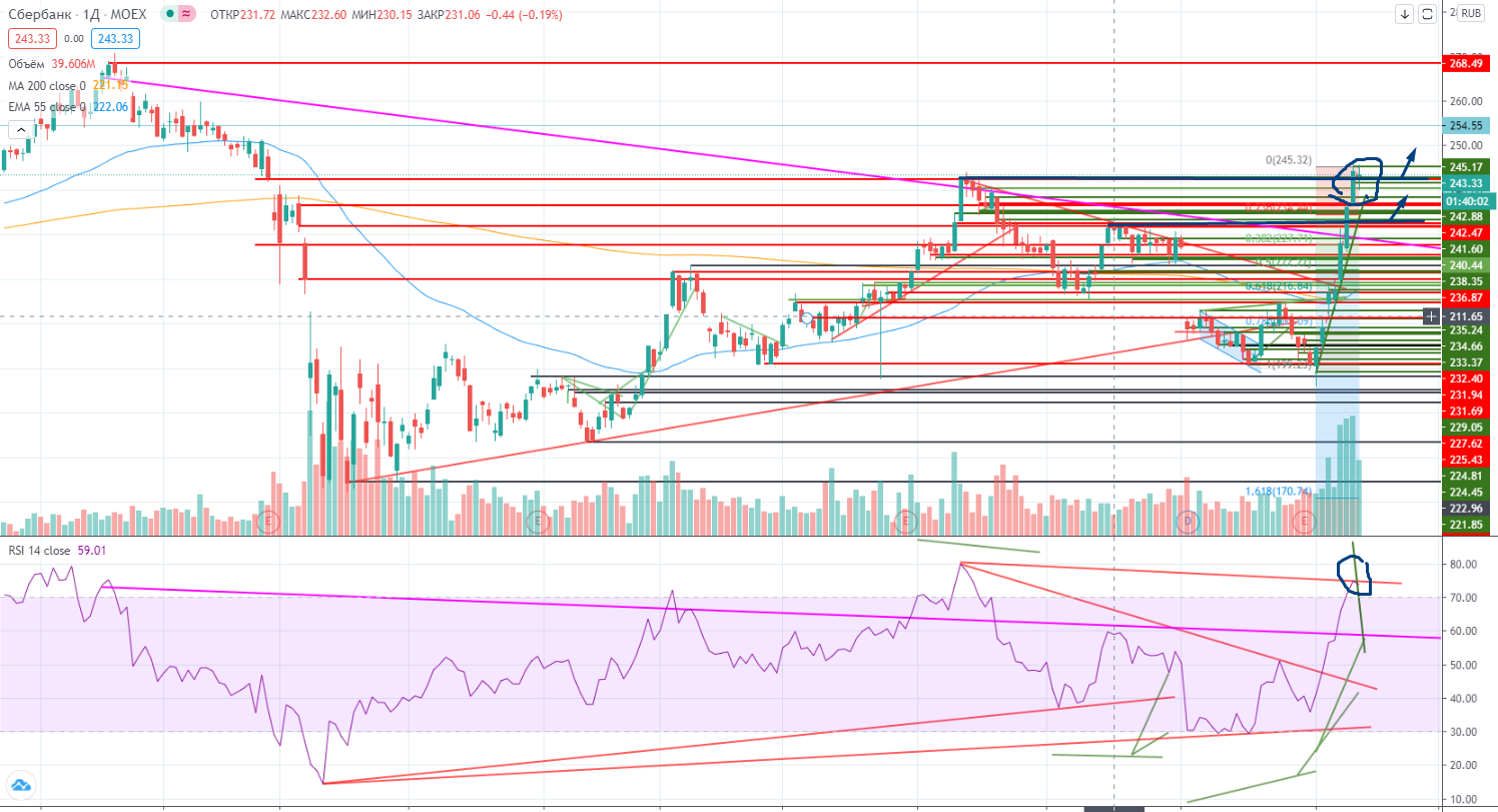 Итак Сбер на неделе вроде как пробил уровень сопротивления 240, но при такой волатильности говорить о пробое пока рано. Все будет зависеть от закрытия, причем не «пипс в пипс», а погрешностью ± % хотя бы. Говорить о проходе дальше вверх пока рано.