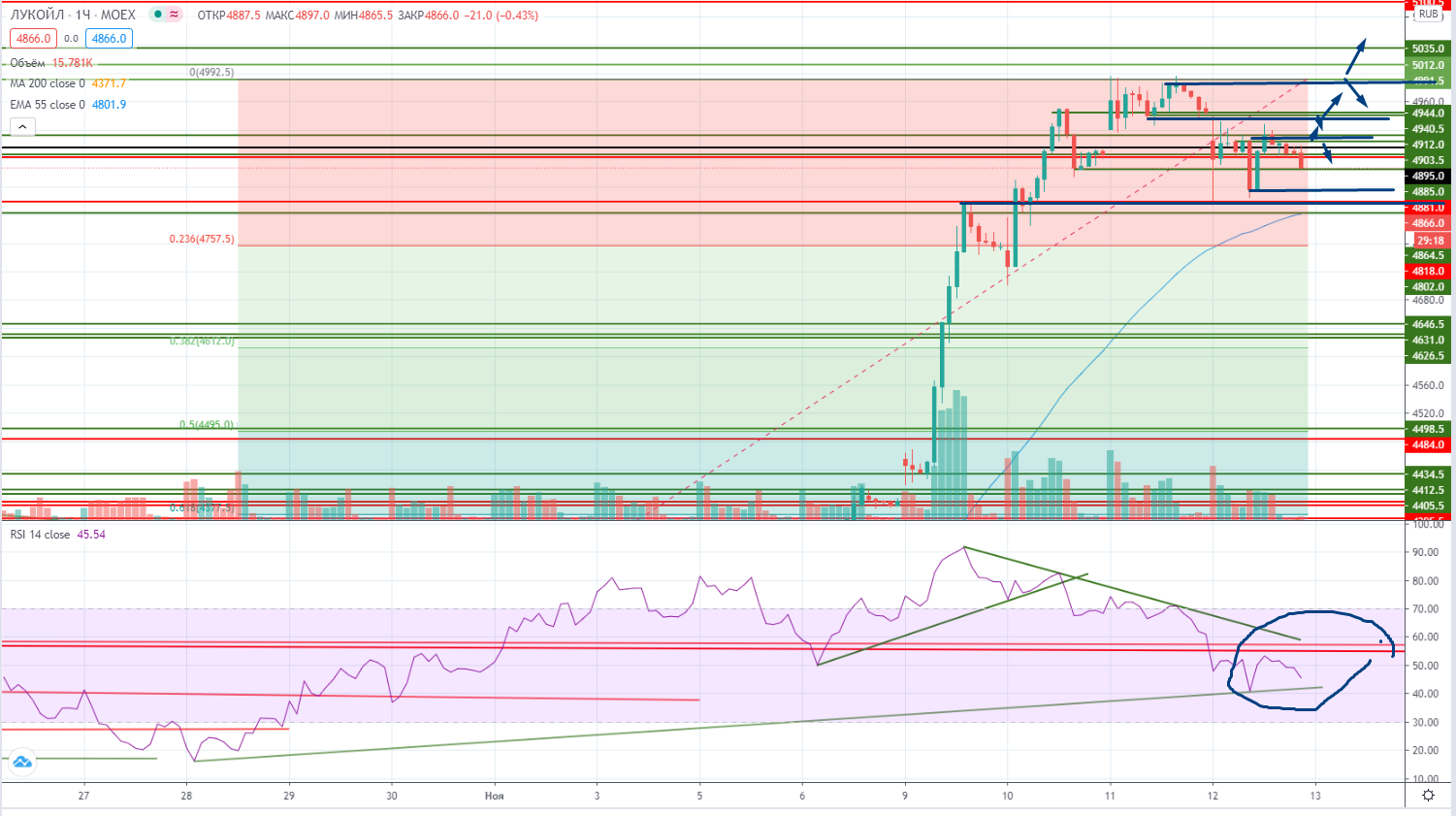 Но на часах картина несколько иная. Во первых можно продавать под уровнем гэпа 4940- со стопом 4950+, но и при проходе уровня 4903+ можно покупать со стопом 4890-. Во вторых есть еще реперный уровень 4986 (психологический 5000), от него тоже можно торговать сначала вниз, но со стопом. И может даже с переворотом вверх. Но и в нем RSI примерно в середине диапазона, так что можно искать поддержки и покупать. К сожалению из за мегароста четких поддержек пока нет, приходится чисто эмпирическим путем их тестить, ноне всегда это получается в плюс. Так что совет, если вошли в лонг, то сразу мысленно нужно ставить стоп и при проходе ниже стопа сразу крыться. Ситуация совсем может не быть бычьей и радужной.