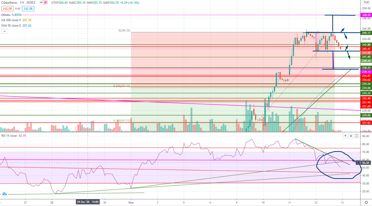 На часах RSI вышел из зоны перекупленности и можно это использовать. Бумага торгуется локально в канале 241,68-245,23, торговать рекомендую из этих соображений с короткими стопами… Причем при пробоях можно относительно смело вставать в направлении пробоя с мишенями 238,15 и 248,78. Расклад такой.