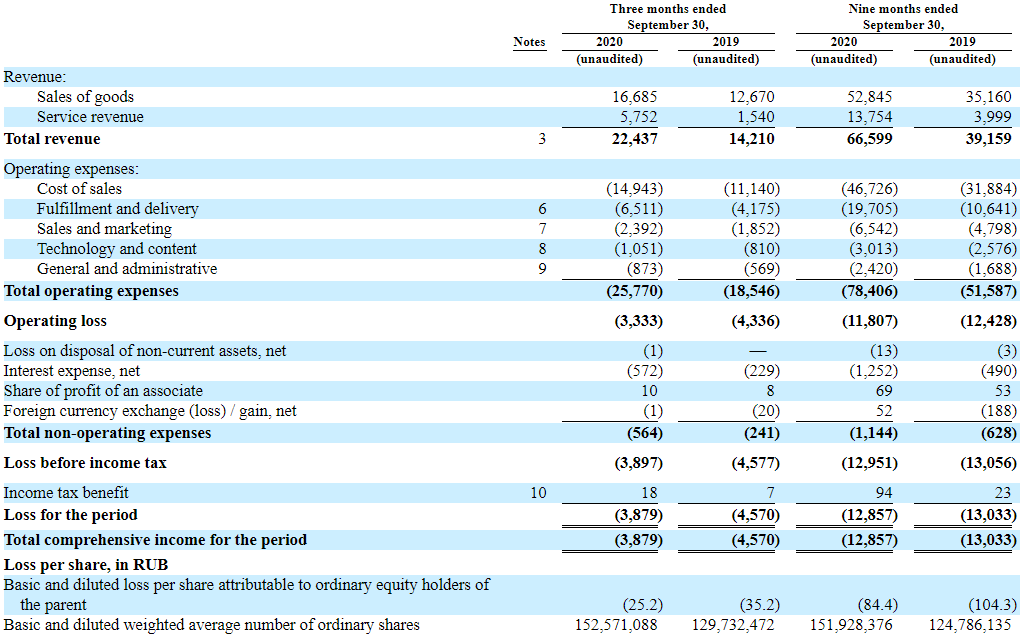 Бизнес-модель основана на связи между транзакций между покупателями и продавцами на торговой площадке, которая составляет 15% выручки за девять месяцев, закончившихся 30 сентября 2020 года. Также продают продукцию напрямую покупателям через бизнес прямых продаж, который составляет 79% выручки за девять месяцев, закончившихся 30 сентября 2020 г. Эта проверенная во всем мире бизнес-модель онлайн-рынка для сторонних продавцов, дополненная собственным бизнесом, позволяет предлагать российским потребителям по данным INFOLine, самый большой ассортимент товаров, включающий около 9 миллионов наименований товаров, по состоянию на 30 сентября 2020 года, в различных категориях: от электроники, предметов интерьера и декора детских товаров до товаров повседневного спроса, свежих продуктов и автозапчастей, по конкурентоспособным ценам и с большим выбором вариантов доставки. Эта бизнес-модель также позволяет лучше управлять запасами и расширять возможности покупателей при совершении покупок в Интернете для определенных категорий продуктов и географических регионов через бизнес прямых продаж.