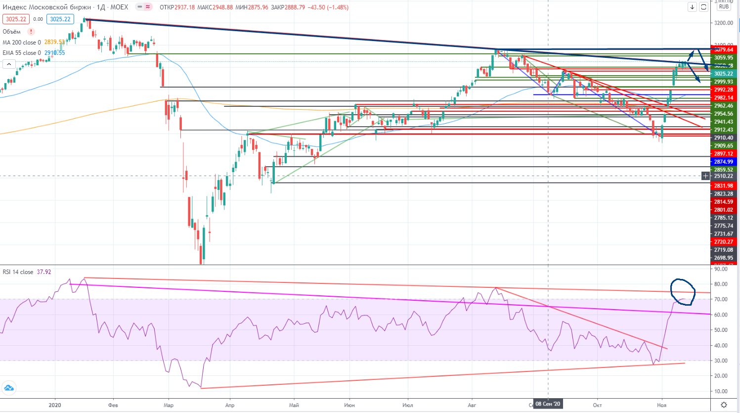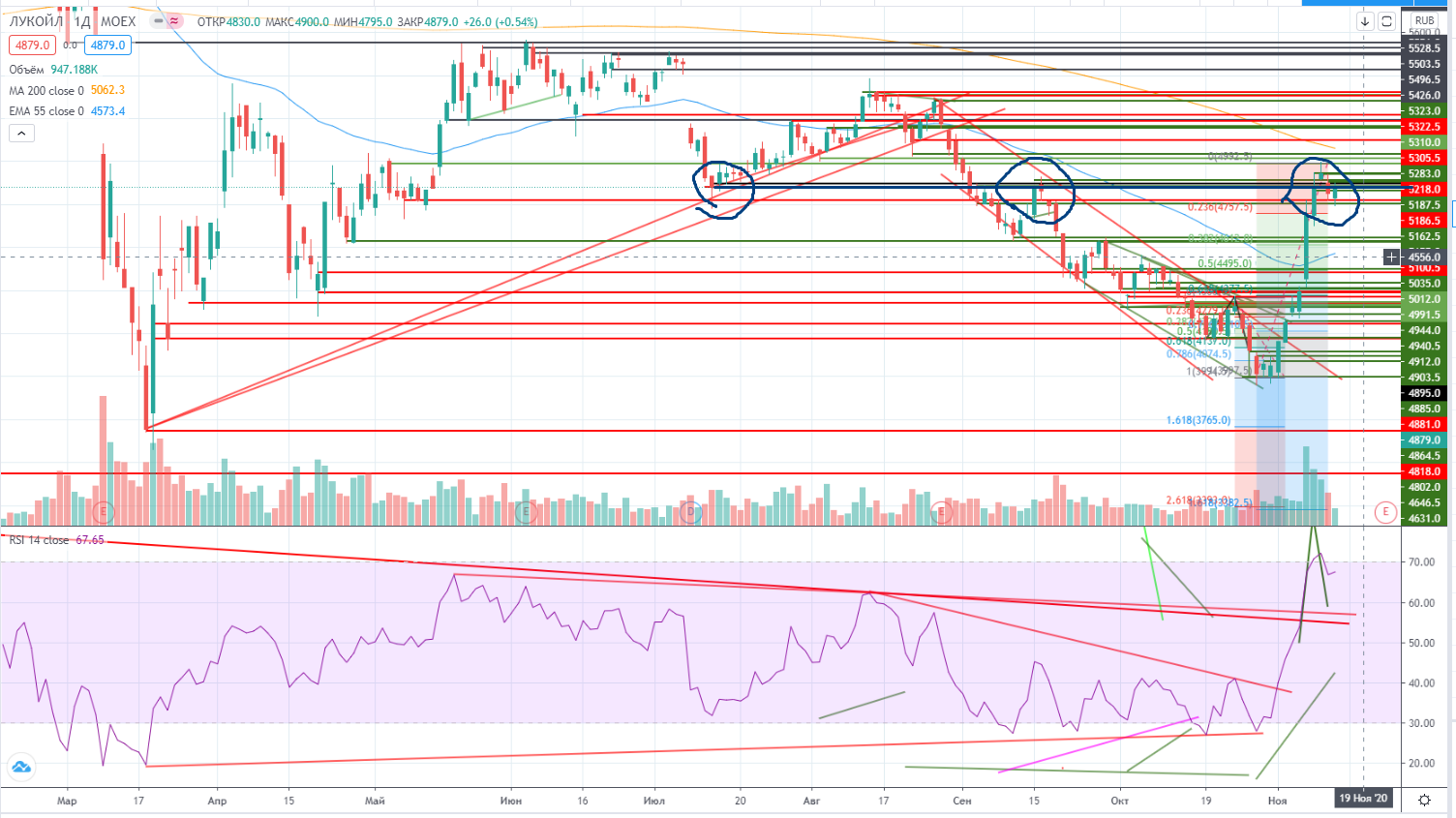 Как я и писал накануне (https://www.finam.ru/analysis/marketnews/samymi-interesnymi-bumagami-etoiy-nedeli-byli-sberbank-i-lukoiyl-20201113-09500/)- «Он закрылся почти на моем треклятом уровне 4884 рублей, нарисовав при этом разворотную формацию. И при негативном сценарии он сегодня может получить лишнее подтверждение этому. Тем более, что и RSI вернулся ниже зоны перекупленности.». И в пятницу почти было подтверждение этому, но опять же вечерний выкос немного подкосил мою теорию. Но даже при этом нелогичном на мой взгляд выкосе, он все равно не взял по закрытию уровень 4884, так что формально пока мы имеем ложный проход.