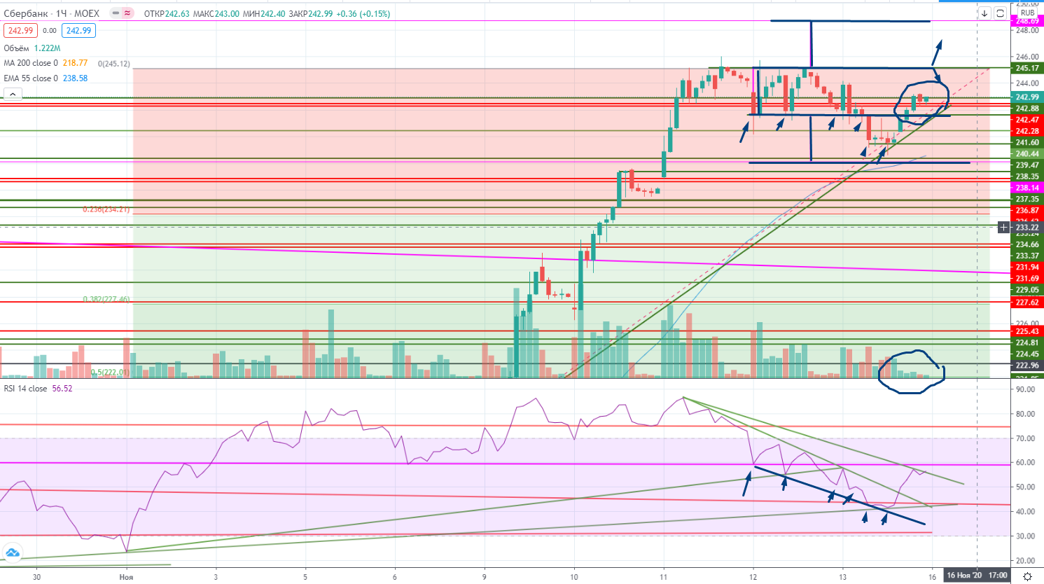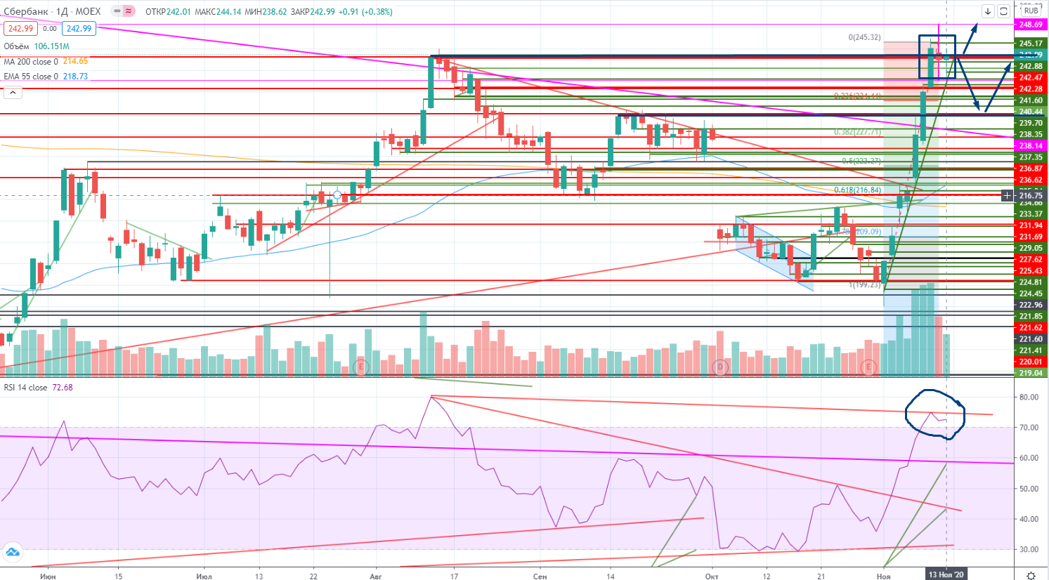 Коренным образом вечерний вынос изменил картину во всех бумагах, но особенно в Сбере. Так на недельном графике по закрытию «основной» сессии так и не прошел уровень 240 ( https://www.finam.ru/analysis/marketnews/samymi-interesnymi-bumagami-etoiy-nedeli-byli-sberbank-i-lukoiyl-20201113-09500/ ), но благодаря выкосу он типа прошел его. Все будет решаться на следующей неделе, очень вероятен как ложный проход, так и возможность к откату. Надо смотреть.