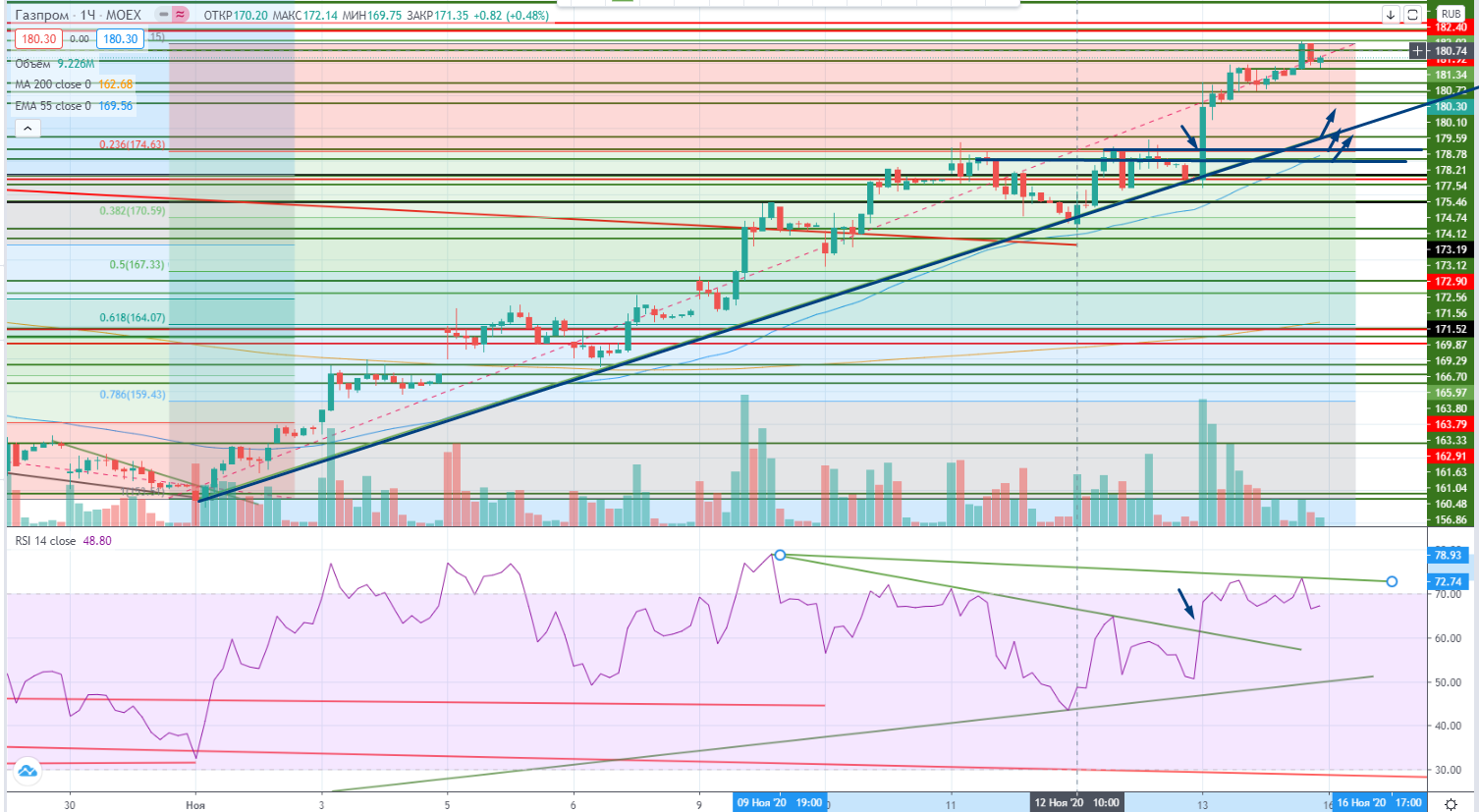 Газпром начал лидировать в росте, он перехватил пальму первенства у Сбера и Лукойла, пробив реперный уровень 173, теперь у него похоже цель на 183,8-184. Но Газпром растет обычно последним, так что еще и этот факт надо учитывать… И на нем можно пробовать покупать.