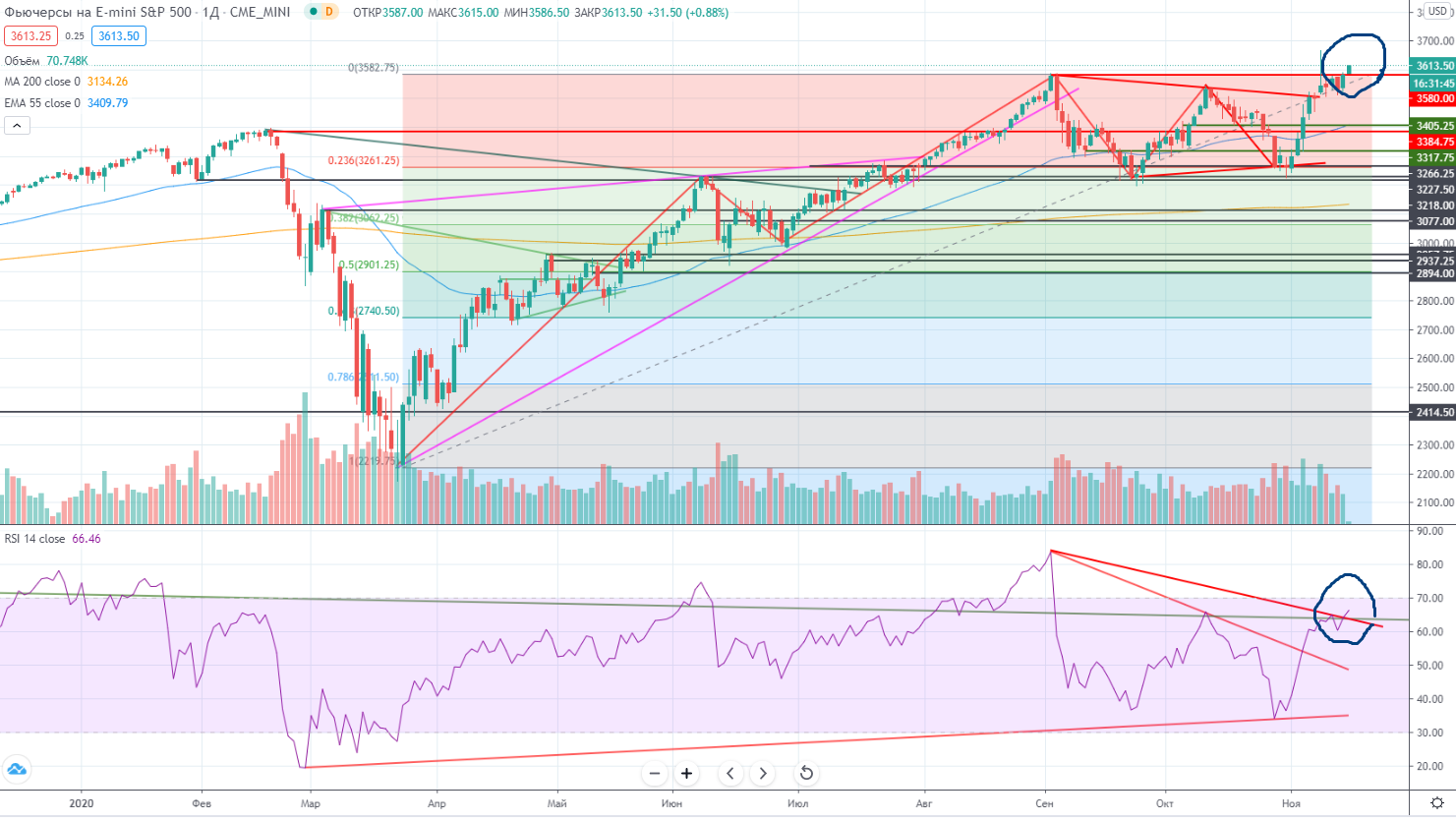 Но при этом фьючерс на S&P растет, идет прокол 3600, и RSI локально подтверждает этот прокол. Но все равно потенциальная дивергенция присутствует, и пока она не разрешится, инвесторам нужно быть начеку.