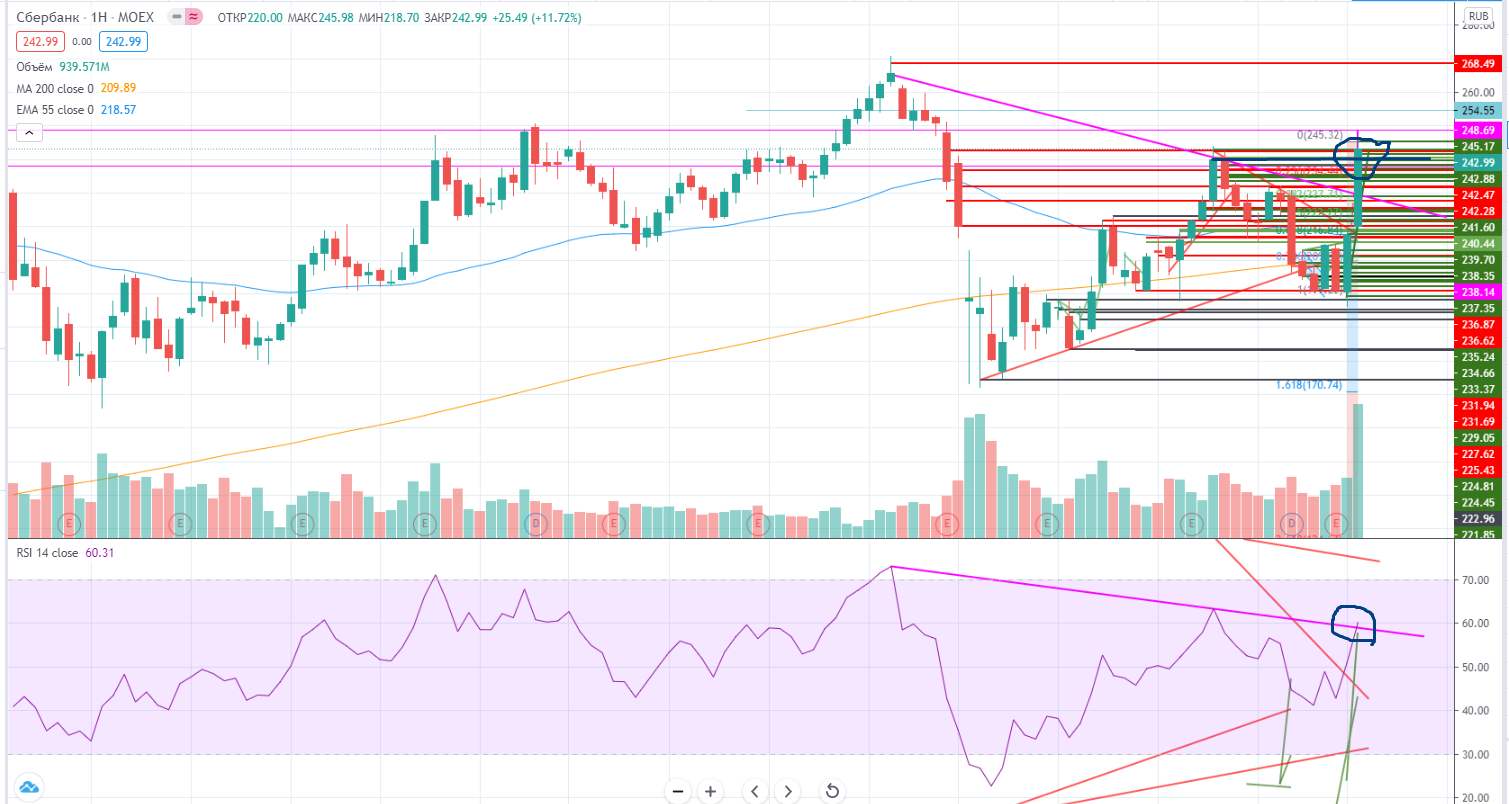 На часах картина также испорчена «вечерним» выкосом. Надо заметить, что уровень 241,68 держался очень долго, тем самым подтвердив свою актуальность. Потом последовал вполне логичный пробой, и при каждом новом лоу индикатор рисовал очередное свое. Т.е. до выкоса все было логично. Но потом он без боя сдался на милость быкам. Но объемы были минимальные, и на чем этот выкос был мне пока не понятно. Но и уровень 245,23 все же есть (я очень на это надеюсь, если в Сбере еще действует теханализ), на нем можно снова пытаться продавать. Но с коротким стопом и может даже стоит переворачиваться вверх до минимальной мишени 248,7±.