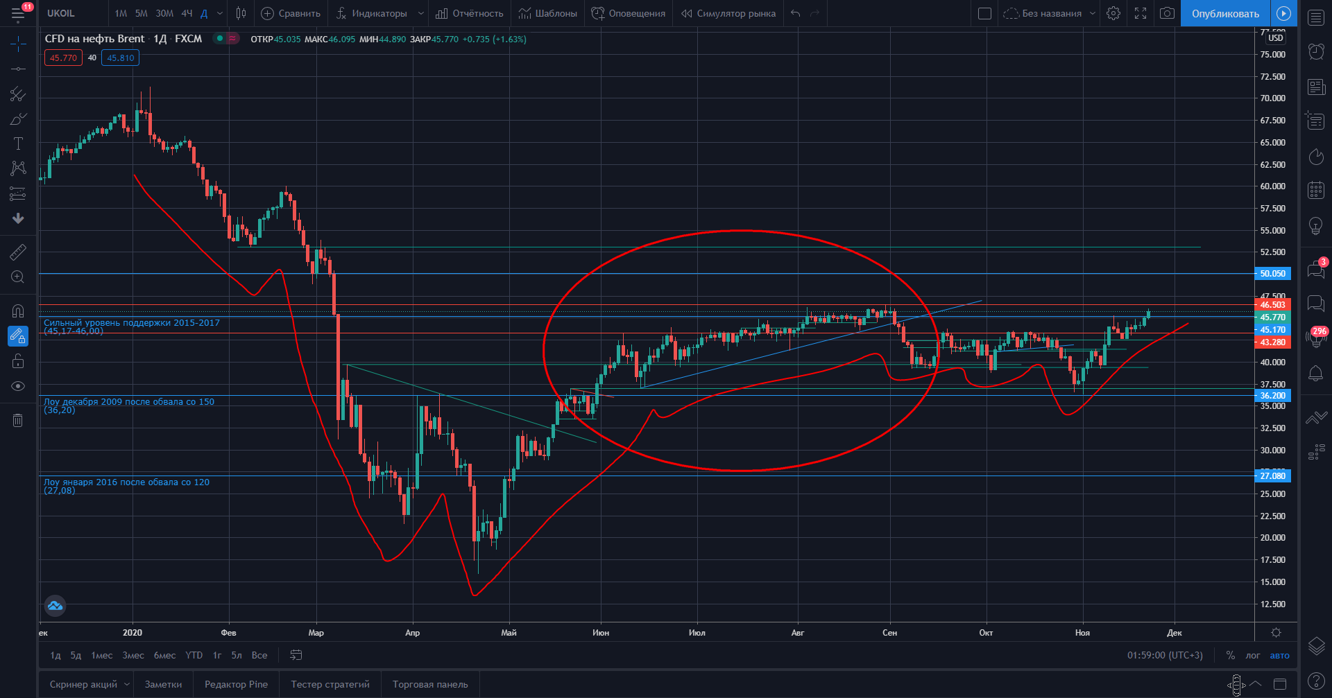 На рисунках 1 и 2 представлены дневные графики боковиков 2017-го и 2020-го годов. Объединяет их то, что они были сформированы после обвала с формированием многолетних лоёв, и резкого восстановления с этих лоёв. Цена загонялась к локальным хаям, и там отстаивалась. То же самое было в октябре, только на меньшем масштабе. Разберу его позже в общем разборе (Рис. 5).