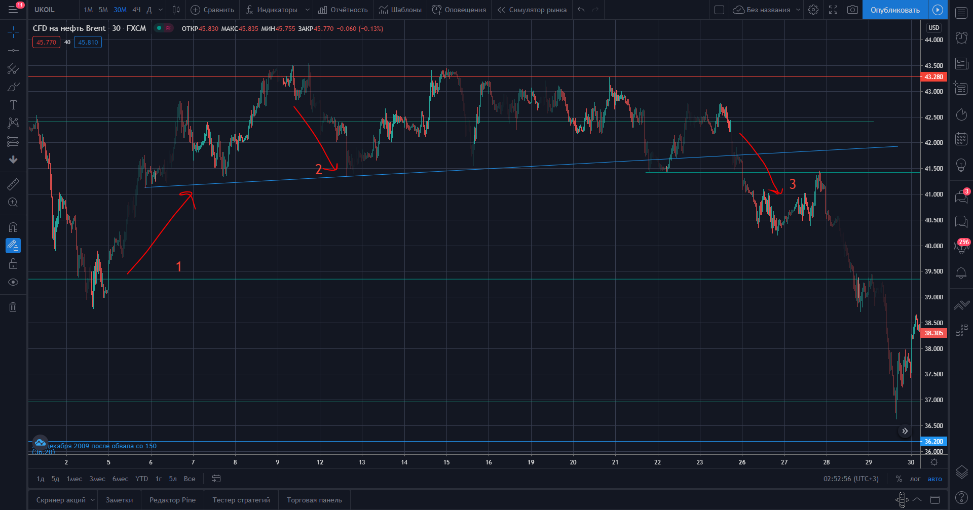 На рисунке приведён октябрьский боковик со стрелками, отображающими реакцию на новости. Стрелка 1 - новость о забастовках в Норвегии и выбывании 300 тысяч баррелей нефти в сутки. Стрелка 2 - новость о том, что Ливия планирует вернуться к поставкам нефти более 1 миллиона баррелей. Стрелка 3 - утверждение Лививей плана по добыче более 1 млн баррелей в сутки. Это и для понимания адекватности реакции на новости и для сравнения с первым вариантом боковика, чтобы наглядно представлять, что нас потенциально может ждать.