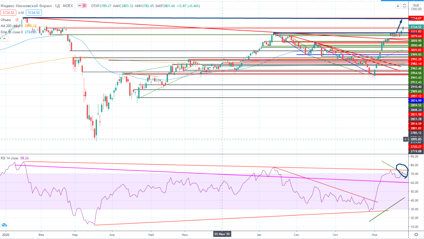 Индекс ММВБ не только прошел мишень от пробоя «сэндвича» 3114 (https://www.finam.ru/analysis/marketnews/indeks-mosbirzhi-prodolzhit-rasti-do-3114-punktov-20201125-10300/), но и прошел выше. Открылся путь к историческому хаю. Правда пока есть противоречия с RSI-он пока под трендом и в зоне перекупленности, но то, что он вышел из пилы с сопротивлением 3080 для меня очевидно, и в случае коррекции он будет выступать мощнейшей поддержкой. Торговать на нашем рынке пока нужно только от лонга!