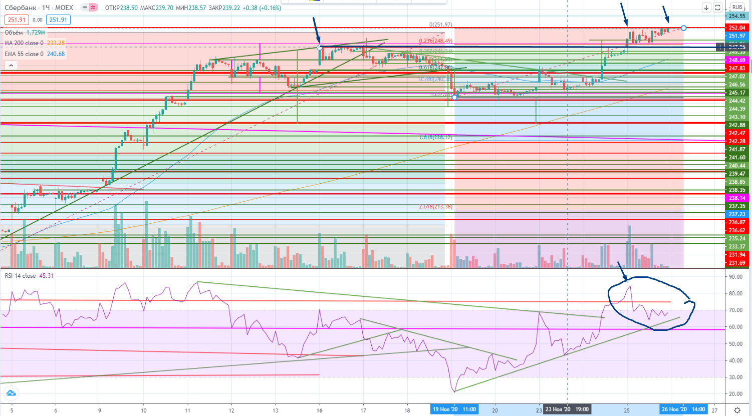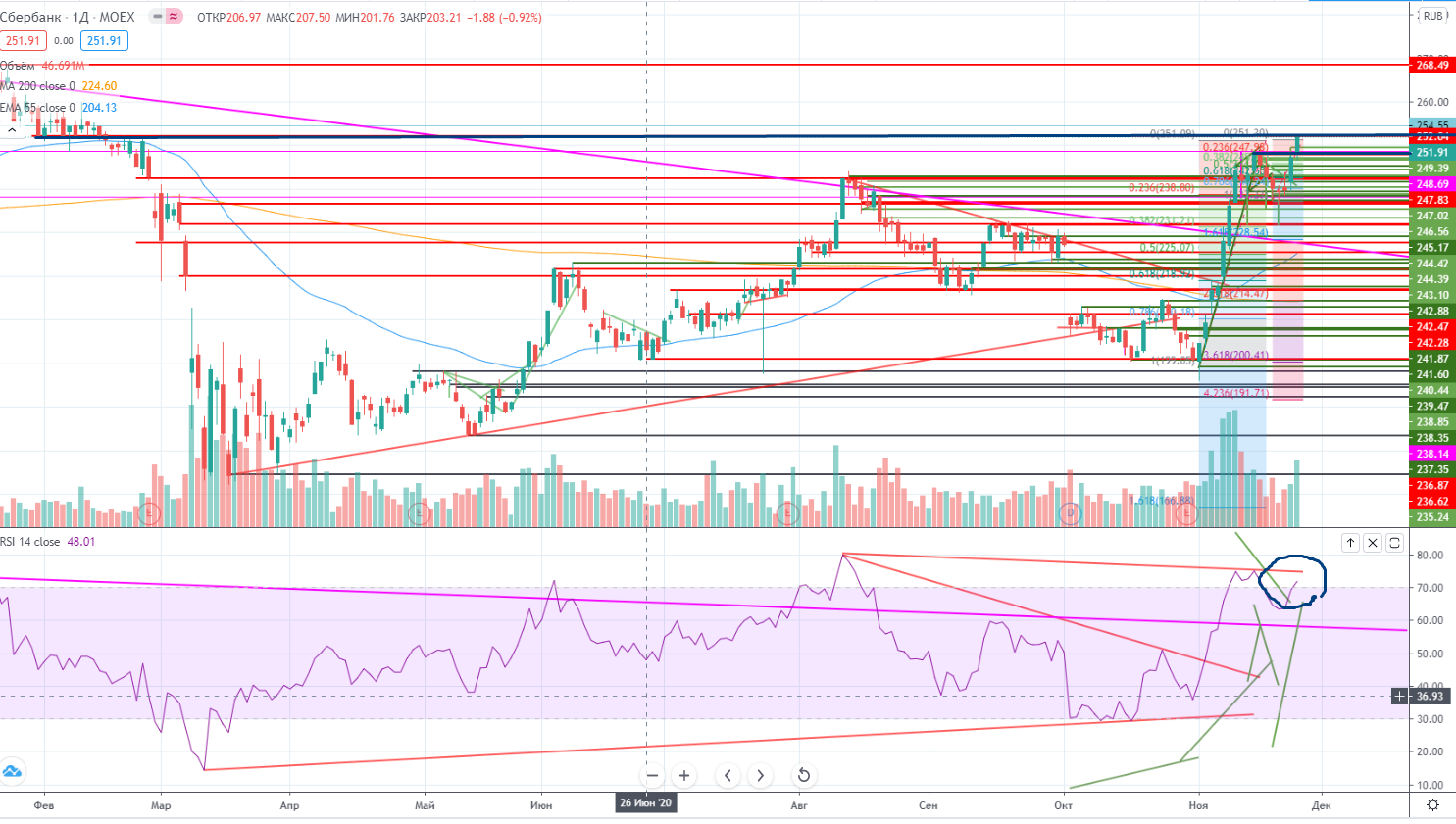 Сбер продолжил свой рост и пришел касанием к локальному сопротивлению 252,2. Это и будет являться сопротивлением ± . Тут и RSI под трендом, и в зоне перекупленности индикатор снова вошел.