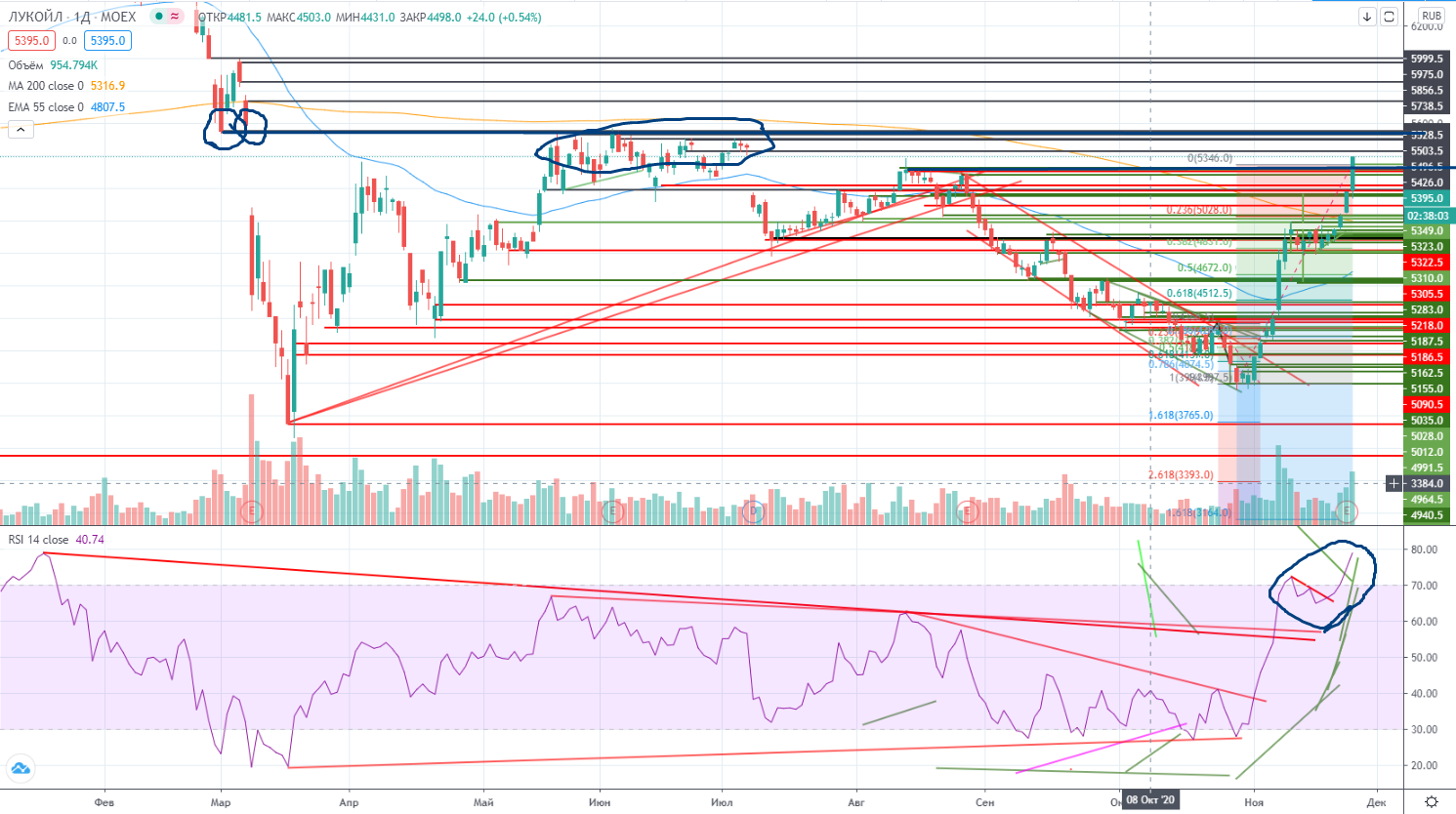 В Лукойле аномальный рост продолжился. Видать сказывается почти двухнедельное стояние. RSI в зоне «ЖУТКОЙ ПЕРЕКУПЛЕННОСТИ», но рост тем не менее продолжается, и я лично совсем не удивлюсь, если к концу (а может даже и сегодня) он достигнет основного уровня сопротивления 5550. Все предпосылки для этого есть. Четких уровней для покупки нет, слишком агрессивный был рост, поэтому в моменте бумага потеряна для торговли. Но то, что нужно торговать исключительно от покупки для меня очевидно.