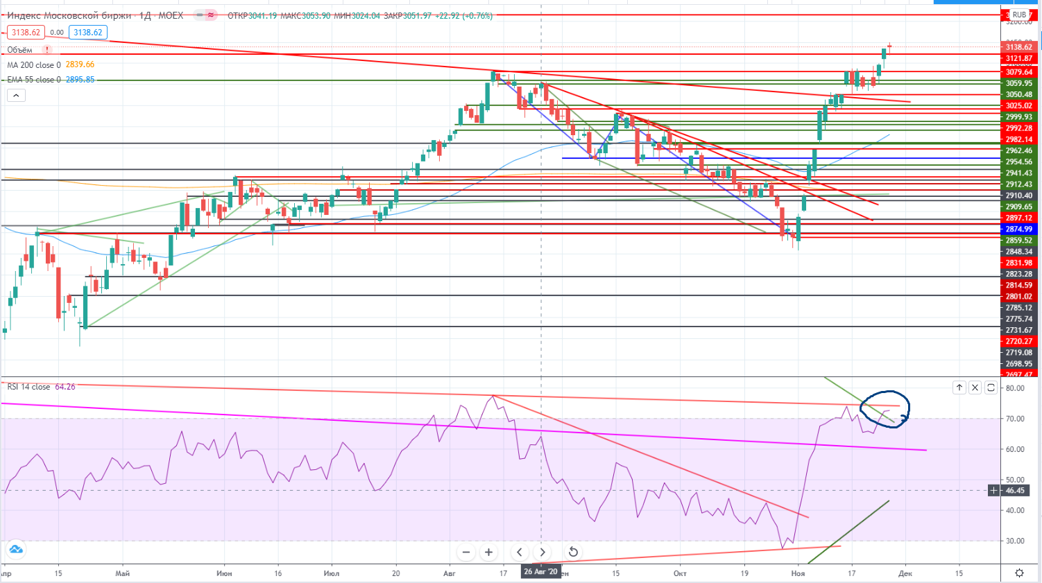 И на дневном графике не удержал уровень 5300±. Лукойл вообще бумага «в себе». То ложно прокалывает реперные уровни, то потом улетает ввысь. Не было дивергенции на хаю (хоть RSI и в зоне перекупленности). Поэтому все таки хочется верить как минимум к попытке возврата хотя бы к 5300-, а там нужно смотреть.