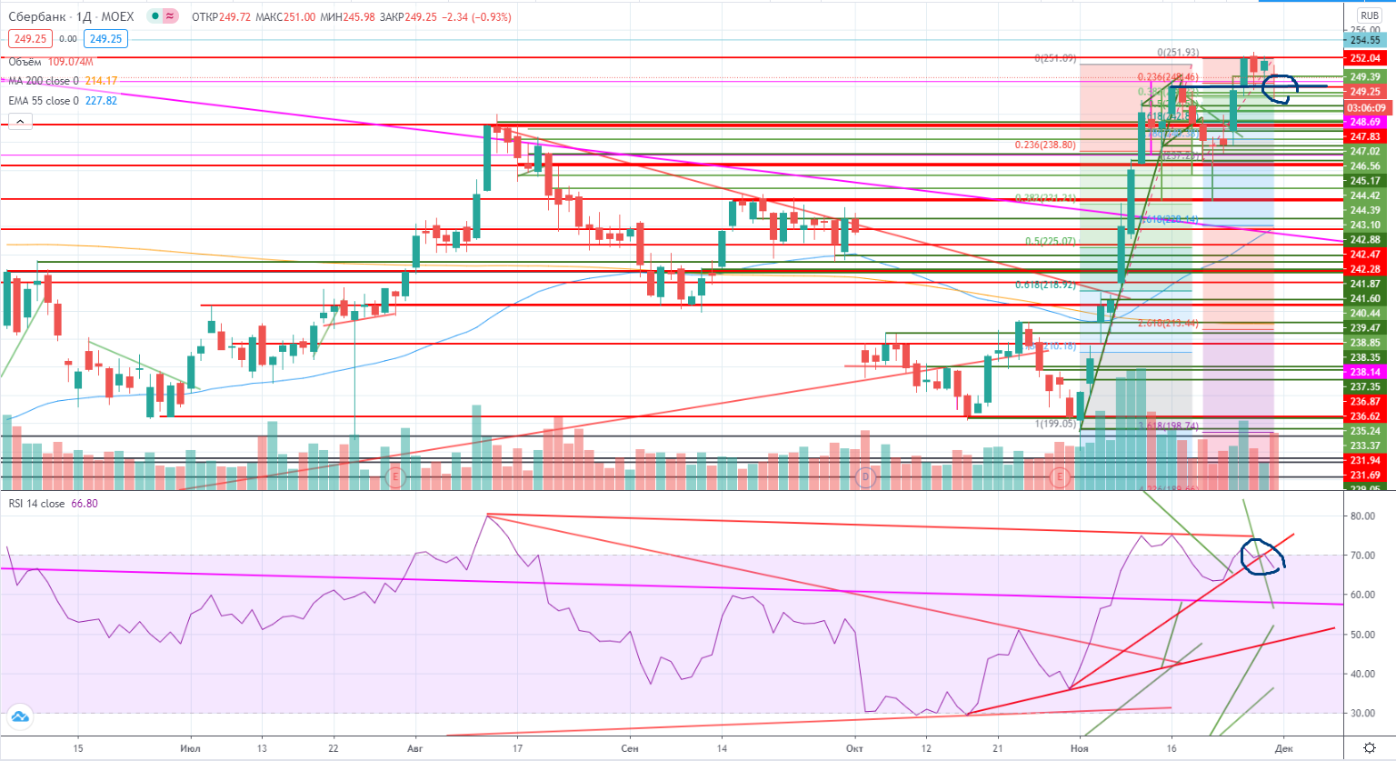 От шорта в случае роста можно продавать под уровнем 250,8- со стопом 251, А дальше тоже непонятно. Вроде как можно прикрывать лонг под локальным хаем 251,9-, но в случае прохода выше 252+ я реально не знаю, что буду делать. По идее можно покупать, но меня лично пугает потенциальная дивергенция с RSI, которая будет постоянно «висеть». В уме ее точно надо держать и в случае прохода обратно под 251,7- надо точно закрывать лонги в данной бумаге.