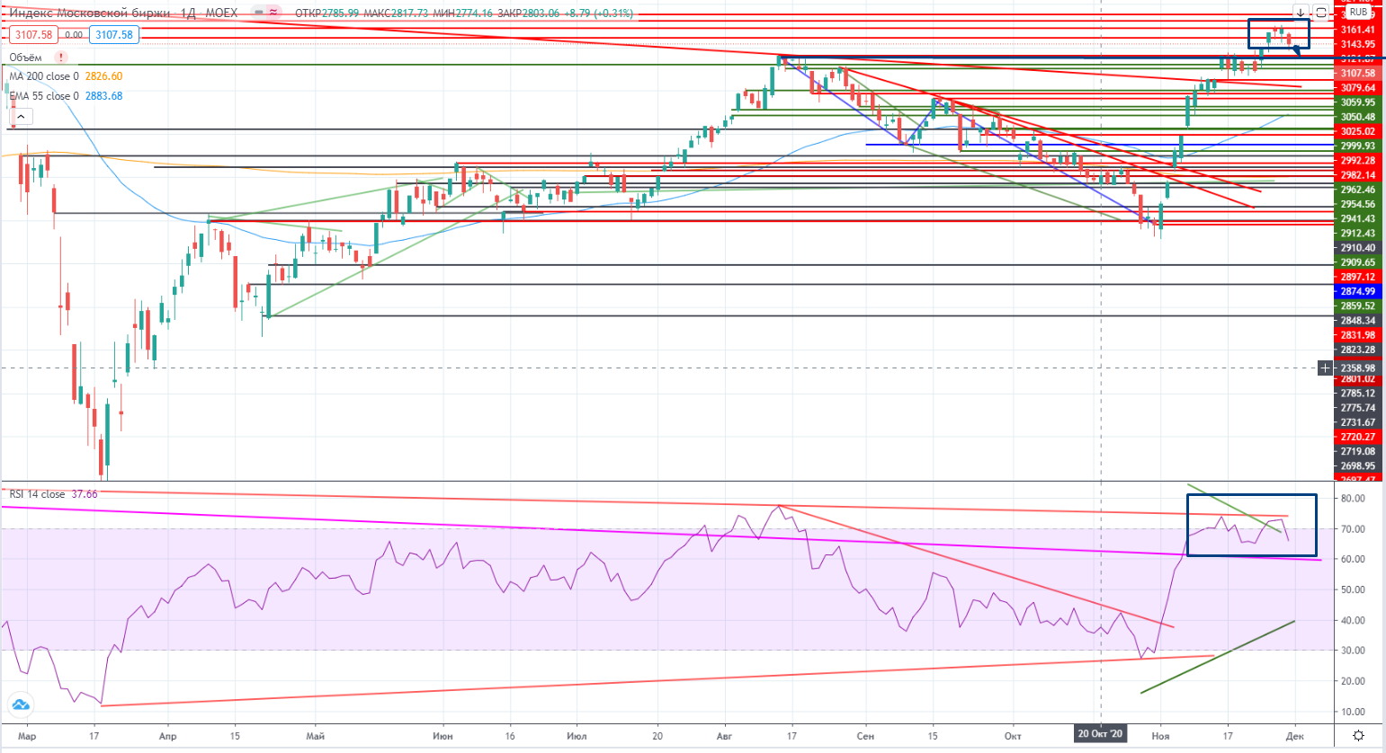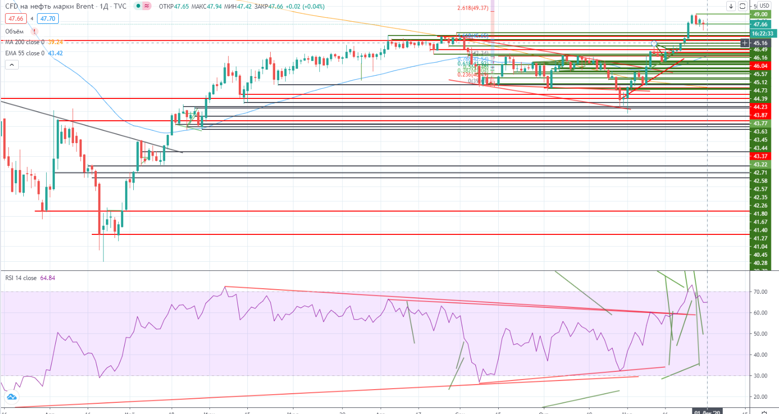 Вчера снова был день нефти. Точнее неясности в переговорах стран ОПЕК и НЕ-ОПЕК. Опять неопределенность в ограничениях или нет в добыче вызывает беспокойство в ней. И правильно делает нефть. Ведь еще свежи воспоминания об отрицательных ценах (я конечно не верю в этот форс-мажор), но все же риск определенный есть увидеть ее ниже. А значит и давление на фондовый рынок может быть значительным. Переговоры перенесены сначала на сегодня, но потом оказалось что теперь уже аж до 03,12, но может произойти (как это обычно в последнее время происходит) окончательное решение может так и не будет принято, а следовательно очередной перенос. Большие дела быстро не делаются, а добыча нефти это как минимум на долго.