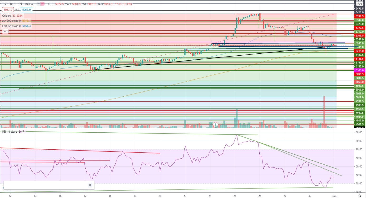 И хотя на часах падение шло по всем канонам падения (каждому лоу в цене соответствовало соответствующее новое лоу по RSI), все же можно было покупать в зоне можно пробовать покупать в зоне 5030-5081 (зона гэпов), стоп 5020-. И я купил по этой схеме, но потом добрал на ребаланировке индекса тройной объем по 5131 (цена «кривой» сессии), часть успел прикрыть перед паническим проливом. А пролив вышел очень сильным, в моменте Лукойл падал более 5%, и я закрылся не дожидаясь окончания часа под 5020 (хотя по закрытию этого часа и не надо было этого делать). Остальную часть лонга закрыл по 5056. Что дальше делать честно не знаю. В случае отроста опять же нужно смотреть на RSI, есть некий уровень 5170-, но продавать ли под ним целиком будет зависеть именно от индикатора. Короче говоря ситуация запуталась. Остается надеяться, что опять пойму что делать по ходу торгов.