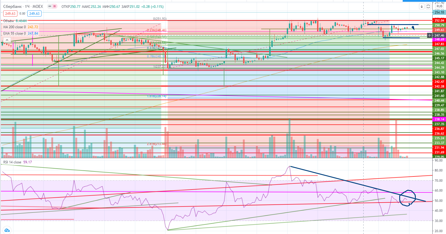 Сбер прокалывал уровень 248 внутри дня, но удержал его в итоге. Ситуация запуталась совсем, т.к. внутри дня образовался промежуточный уровень 247,07, от которого и произошел отскок вверх. Теперь ситуация с заходом в шорт может встать под вопросом. Просто если вчера вход в шорт при пробое 248 подтверждалось RSI, то сегодня возможно этот уровень будет поддержкой. Надо смотреть. Я пока не готов прогнозировать, что нужно делать в случае прохода 247-, возможно даже пропустить сделку.