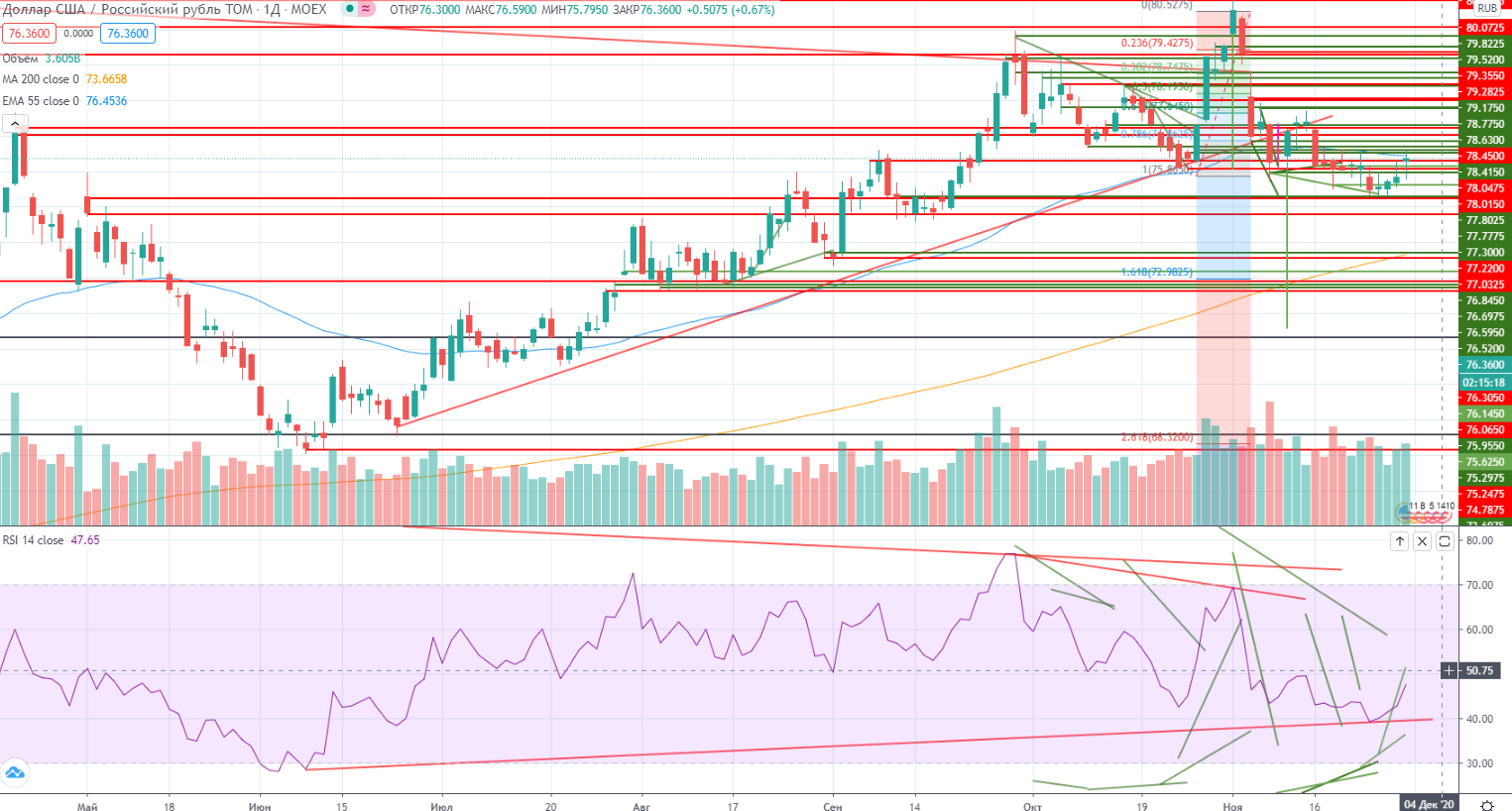 Зато доллар подрос к рублю, причем он сделал это в очень извращенной форме. По утру он выполнил программу минимум, прогнозируемую мною накануне (https://www.finam.ru/analysis/marketnews/vopros-o-predrozhdestvenskom-ralli-poka-ne-snyat-20201130-09400/) — «Наверху не было дивергенции, так что повтор как минимум локального хая 76,25 я не исключаю.» Я закрыл лонг, а потом начался «изврат» в виде очередной покупки на тех же уровнях. Проверка была мощной, но в пределах часа (это тот таймфрейм, на котором я торгую, а следовательно нужно терпеть почти любые издержки (таков метод, увы)), но мне повезло. Хотя «везет всегда сильнейшим!», и доллар по закрытию часа вновь перешел в рост. Теперь правда в долларе опять все непонятно стало. Нарисовалась классическая пятиволновка вверх с дивергенцией на конце. Инструмент временно потерян, но он свое отработал просто превосходно!