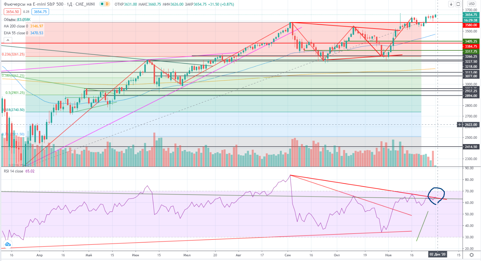 Фьючерс на S&P поставил новый исторический хай по закрытиям и RSI на грани пробоя вверх. Но все равно даже при проходе им тренда, потенциальная дивергенция будет пока «висеть» над рынком, поэтому все возможно!