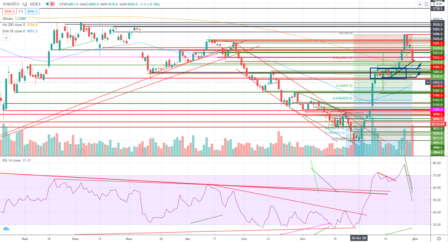 В Лукойле после аномального роста случилось сильное падение. В случае его продолжения реальная зона поддержки располагается на 4830-4950, и вот тут можно сильно попотеть с выбором уровней для покупки. Если это не случится сегодня, то это рано или поздно произойдет. Так что нужно к этому готовится. Что делать я пока не знаю, возможно надо будет частями закупаться в расчете на как минимум подходу к реперному уровню 5280-5310.
