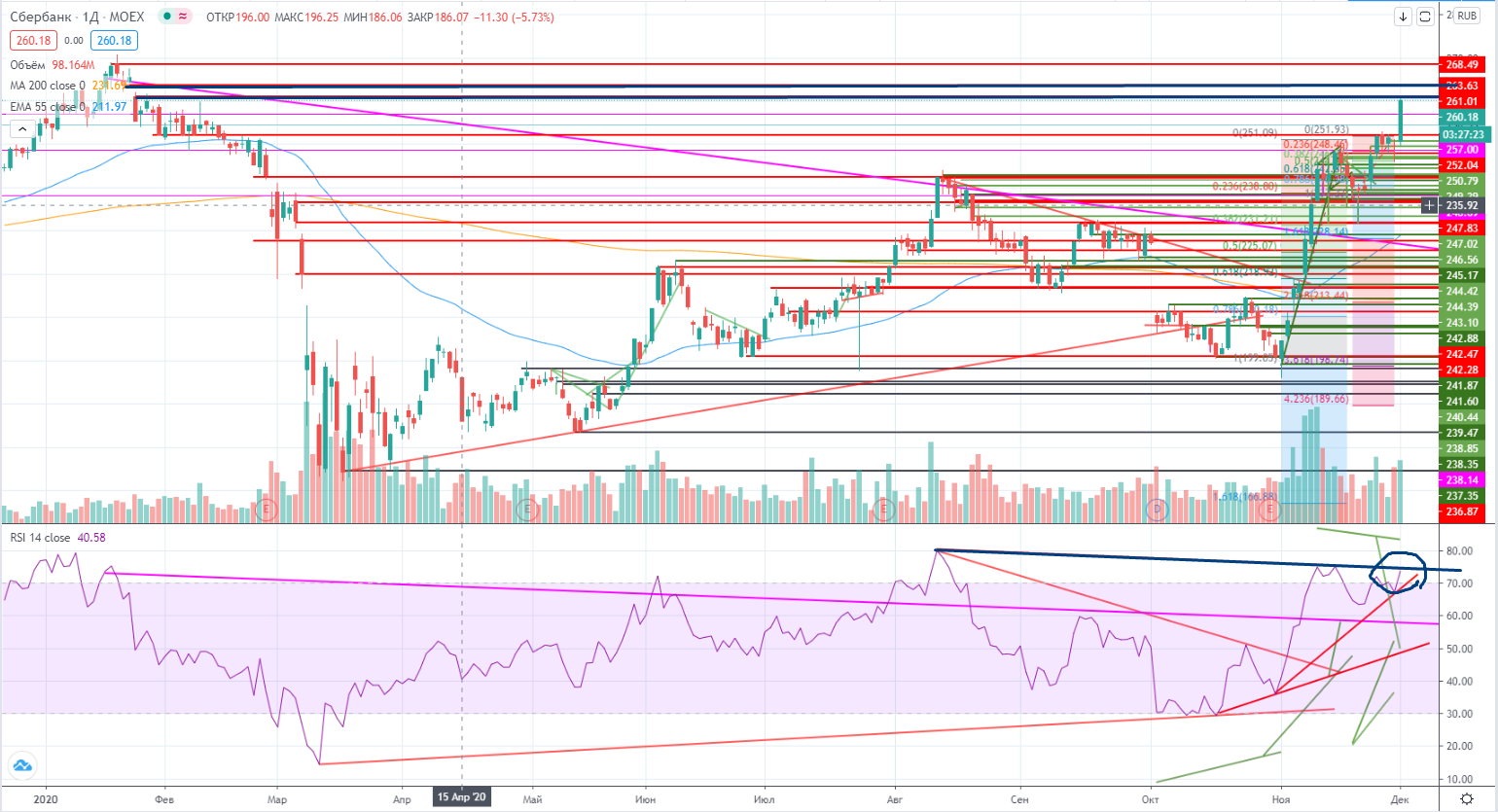 то в Сбере на днях под уровнем гэпа 261-263,73, RSI под трендом, и точно можно прикрывать лонг. Даже можно пытаться шортить (правда стоп растянут), это риск!!!