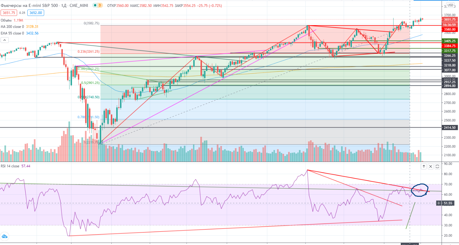 Америка на вновь поднятом разговоре о стимулировании обновила исторические хаи по фьючерсу на S&P, и RSI «накернил» свой тренд. Идиотизм крепчает. Просто как маленькому дитю «дай конфетку», и будут сосать. И наплевать, что экономика уже давно в одном месте. На все положили… Ну хорошо, хоть наш рынок менее идиотичен, по крайней мере пока не так явно. Хотя логики и в нашем рынке мало.