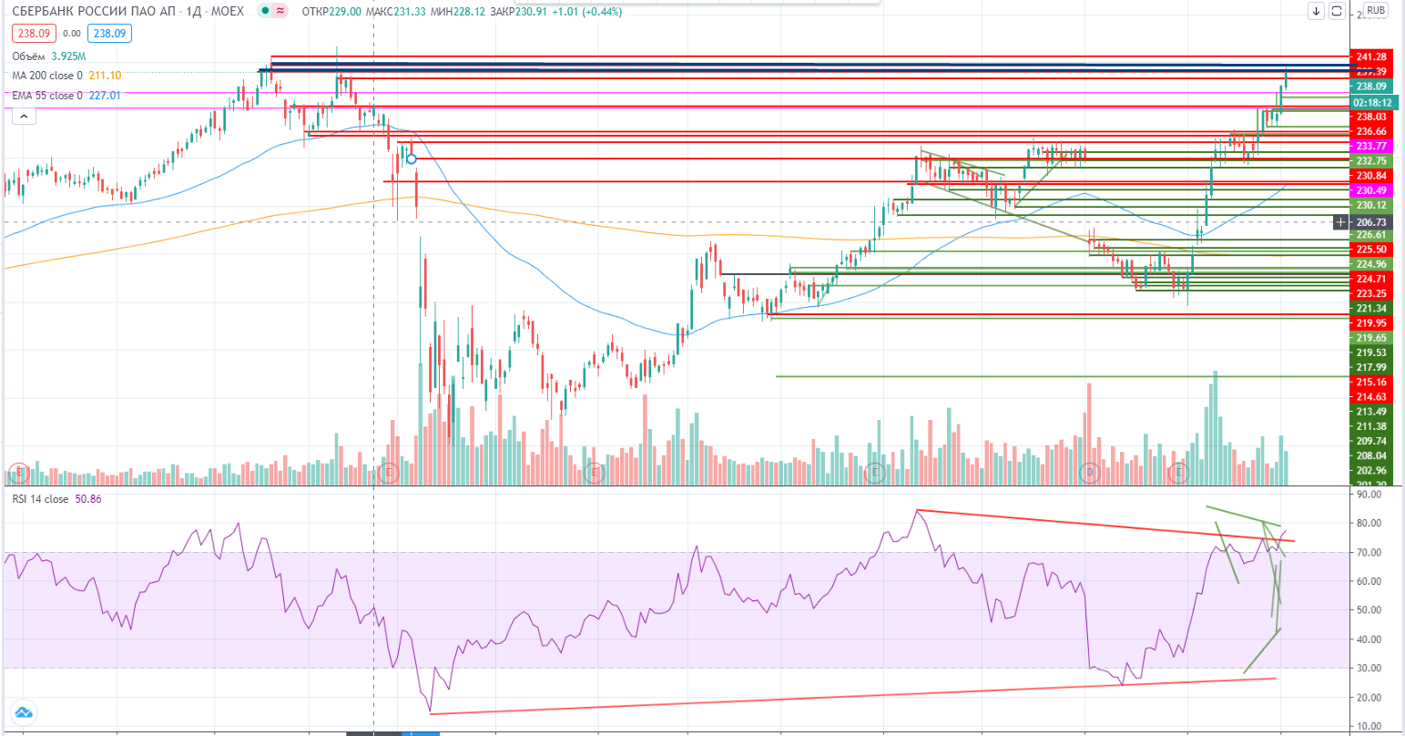 Кстати и Сбер преф закрылся под историческим хаем. Но в этой бумаге своя история, она выглядит последнее время очень сильной и я категорически не рекомендую ею торговать от шорта. Лучше находить уровни и покупать...