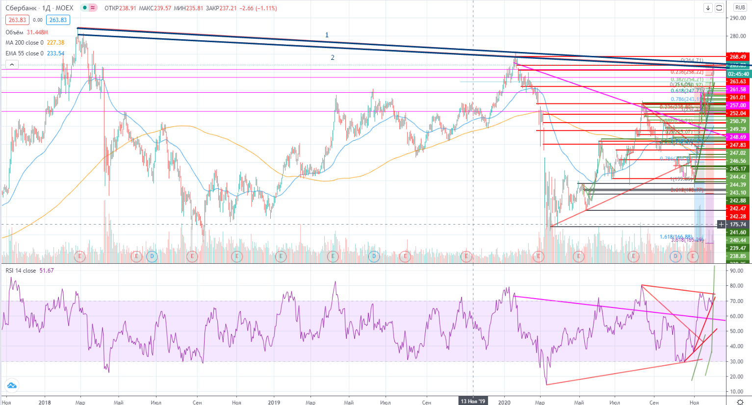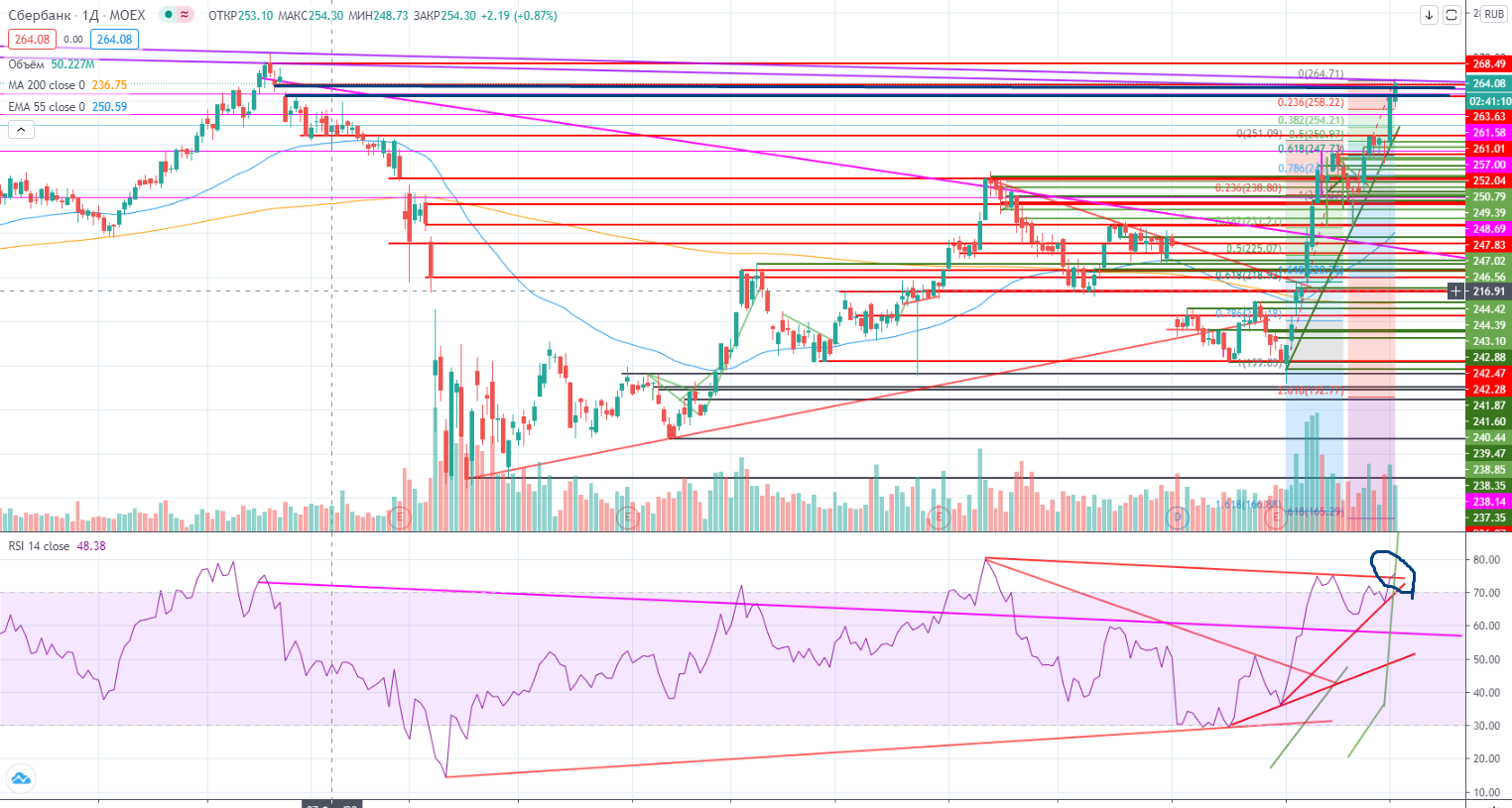 Сбер пришел к трендам. Тренд 2 (по закрытиям) все-таки формально пробит, но Тренд 1 (по экстремальным точкам (хоть я и не приверженец к такому построению трендов)) — нет. Так что пока формально можно считать уровень не взятым.