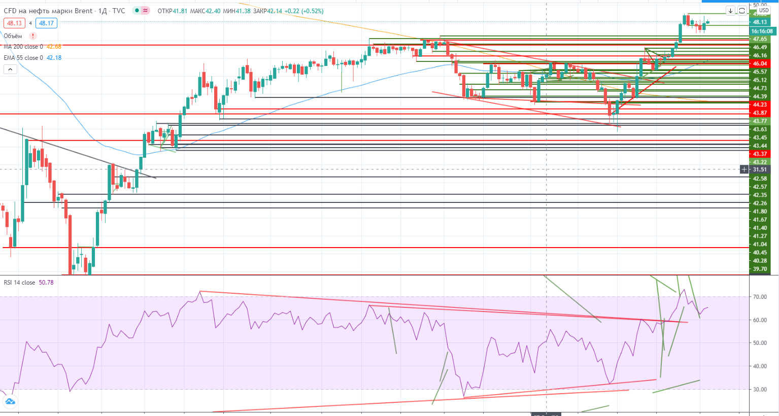 И пока на пройден я считаю верхний уровень гэпа 263,73, по крайней мере на этом уровне наблюдалась сильная встреча. То что RSI «накернил» свой дивергентный тренд вполне допустимо, т.к. из-за слишком большого разброса по датам определенная погрешность очень вероятна. Но если этот гэп закроют, то возможен рост и дальше вплоть до реперного уровня 268.