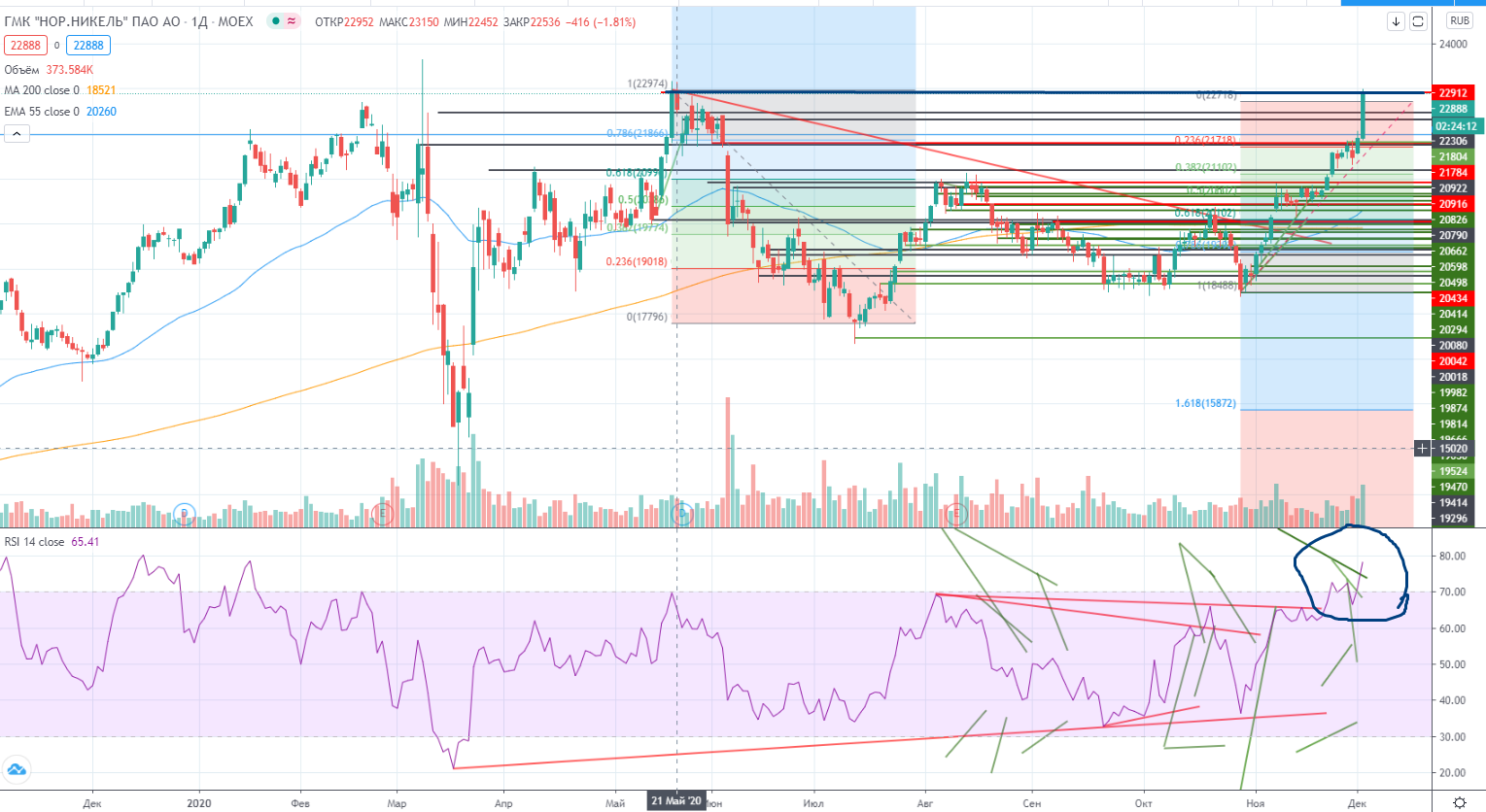 Со всей этой суматохой в Сбере я не то, чтобы пропустил ГМКН (я его уже давно наблюдаю, но купить все не решался), но он почти обновил исторический хай, и кроме перекупленности RSI НИЧЕГО не мешает ему и дальше пойти вверх. Покупать уже поздно, но и фиксировать прибыль от лонга пока нет сигналов. Надо еще посидеть держателям этой бумаги. Если жадность сильна-то можно прикрываться под хаем. Но не все! Уметь терпеть прибыль надо тоже уметь.