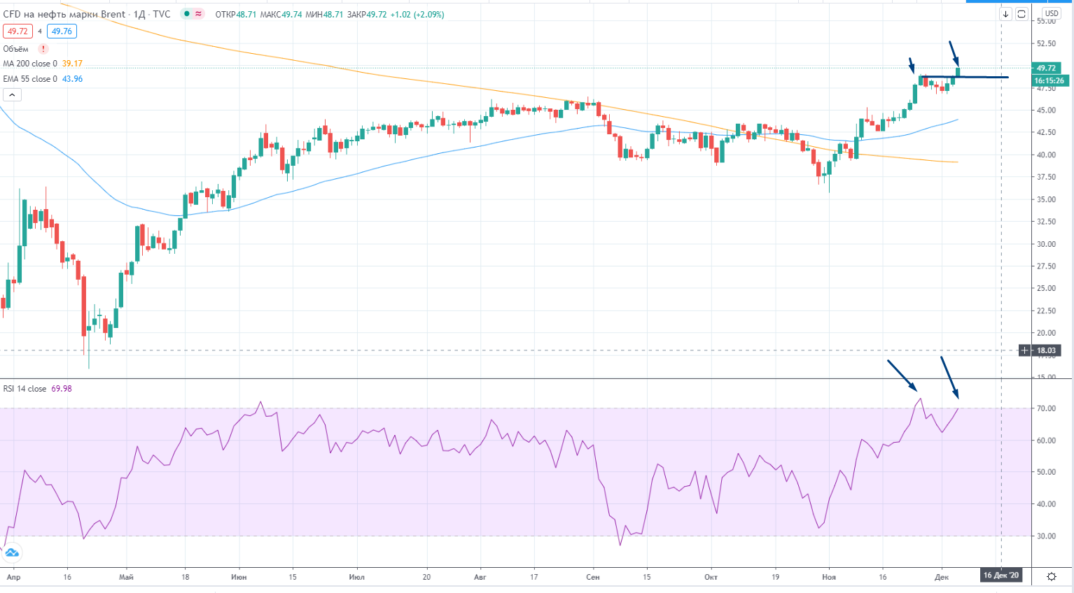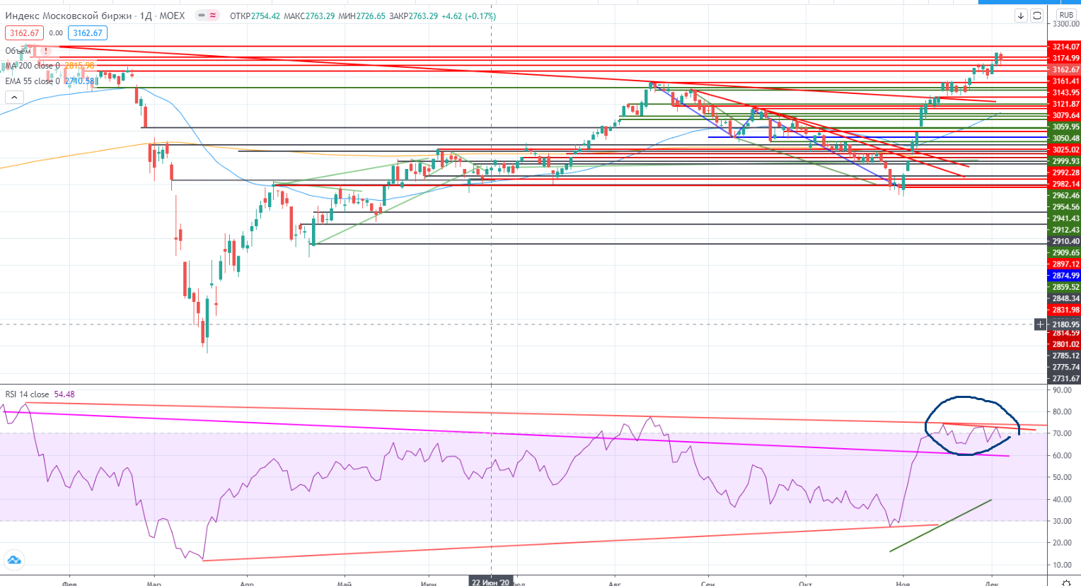 Нефть же поднялась на фоне информации от встречи ОПЕК «По итогам заседания ОПЕК+ было принято решение об увеличении предложения нефти в январе 2021 года с общего увеличения добычи стран ОПЕК+ на 500 тыс. баррелей в сутки.». Вероятно нефть была «готова» к более худшему варианту развития событий, а при таком решении «типа все прекрасно». Но и тут может крыться подвох-очень возможно, что формируется импульс с возможной (!)потенциальной дивергенцией, и если это так, то эти 500 тыс. баррелей в сутки могут «выйти боком». Ведь увеличение добычи в конце концов приведет к перенасыщению в конечном плане, а на фоне еще пока не побежденной до конца пандемией спрос может значительно быть меньше предложения, что в свою очередь приведет к очередному «затавариванию» хранилищ и к очередному падению нефти. Пока все логично получается.