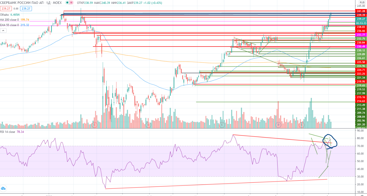 Правда Сбер-преф выглядит сильно, по крайней мере пока. Он обновил исторический хай по закрытиям, но НЕ ПРОБИЛ хай по телам (239,88), хотя RSI уже пробил свой тренд. Эта бумага сильна, но зависит от старшего брата Сбера обычки, и вряд ли она удержится в случае падения последней. Но и при походе Сбера вниз я не рекомендую его шортить. Просто не факт, что более сильная бумага будет сильнее падать. Я советую дождаться уровней пониже и начинать покупать снова. В лонг же в данной ситуации при пробое вверх все же очень рискованно вставать опять же из-за RSI, у которого с трендом опять возможно образуется «дырка».
